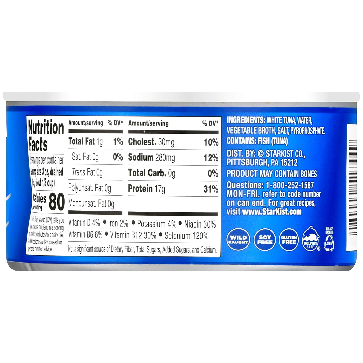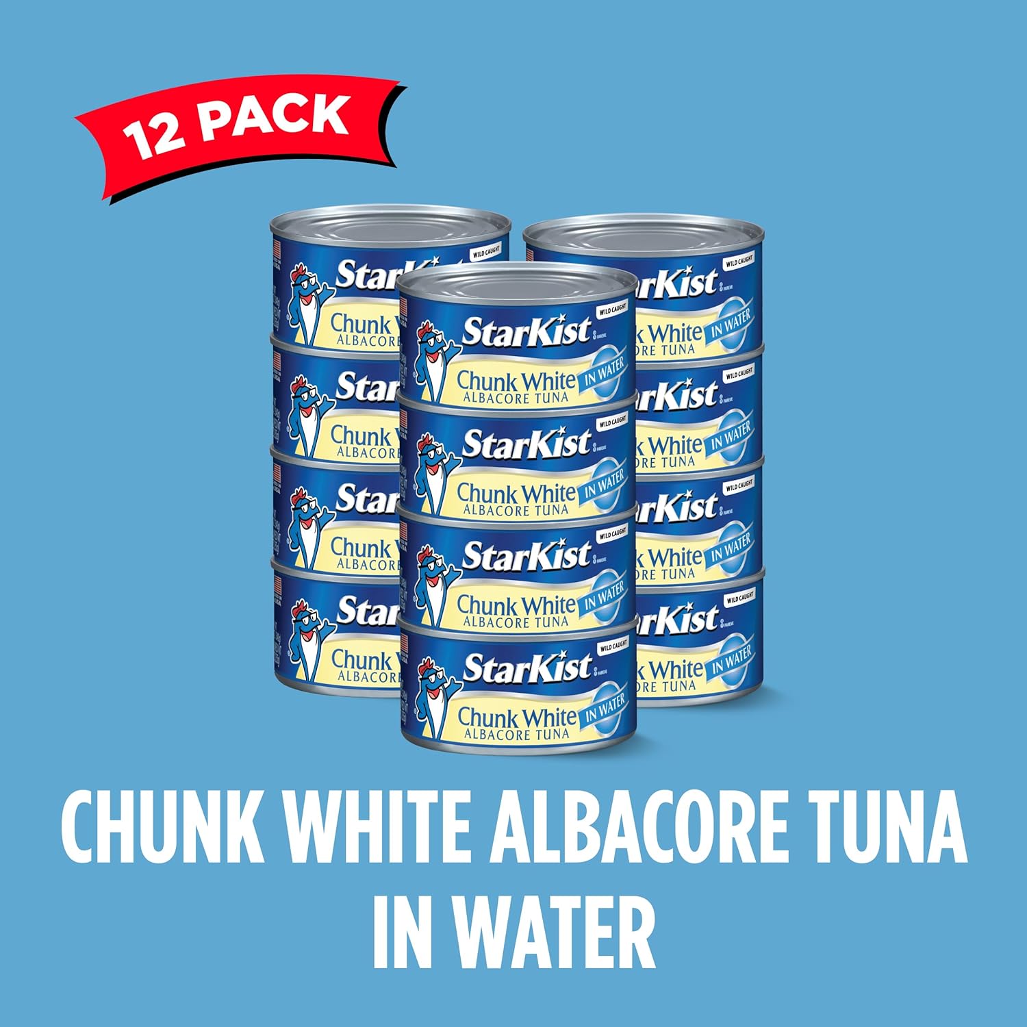 DELICIOUS, MILD FLAVOR: StarKist Albacore Chunk White Tuna in Water contains delicious wild caught albacore tuna. Each of our nutrient dense tuna cans features select cuts of delicious, premium dolphin safe tuna10EXCELLENT SOURCE OF PROTEIN: Our tuna is a natural source of protein and Omega 3s. It has 17g of protein and 80 calories per serving. It’s soy free and gluten free and works well with Keto, Paleo, Mediterranean and Weight Watchers diet plans10ADD VARIETY TO YOUR DIET: Tuna is a wholesome choice for a snack or meal that fits into an active lifestyle. StarKist tuna in water is a great and easy way to add seafood to your diet10VERSATILE: Albacore’s mild flavor and firmer texture makes it a great option for salads, pasta dishes or as a substitute for chicken in your favorite recipe10BULK 12 PACK: Buy your tuna in bulk with the StarKist 12-Pack. These tuna cans are easy to store and great to have handy for when hunger strikes – whether you’re on the go, at the office or at home10Whether you’re squeezing in lunch between meetings during a busy workday or want a quick, protein-packed and nutrient dense snack between soccer practice, school and other daily errands, StarKist Albacore Chunk White Tuna in Water is the perfect choice! These 12 oz cans contain wild caught, delicious tuna. Albacore's mild flavor and firmer texture makes it a great option for salads, pasta dishes or as a substitute for chicken in your favorite recipe. It’s soy free, gluten free and works well with Keto, Paleo, Mediterranean and Weight Watchers diet plans! This dolphin safe tuna is an excellent, natural source of protein and Omega 3s. It has 17g of protein & 80 calories per serving. Plus, it’s a great, quick and easy way to add seafood to your diet! Easy to store, you can stock up with this 12-Pack, and keep tuna cans in your office, pantry at home and even in your diaper bag or car! An industry innovator, StarKist was the first brand to introduce StarKist single-serve pouch products, which include Tuna, Salmon and Chicken Creations, and StarKist Selects E.V.O.O. As America’s favorite tuna*, StarKist represents a tradition of quality, consumer trust and a commitment to sustainability. *Nielsen Custom Scantrak Data xAOC Dollar Share Latest 52 Weeks