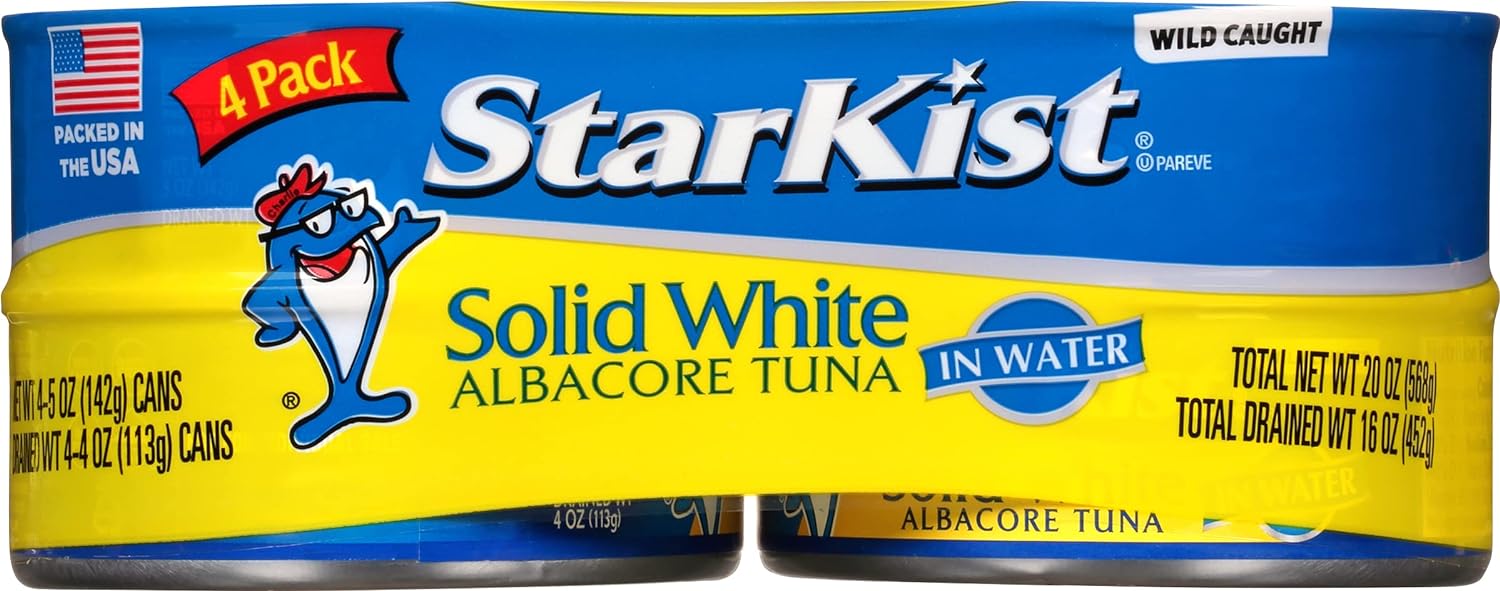 DELICIOUS, MILD FLAVOR: StarKist Solid White Albacore Tuna in Water cans contain a solid fillet of delicious, wild caught albacore tuna. The mild flavor and firmer texture make it a great option for salads, pasta dishes or in your favorite recipe10EXCELLENT SOURCE OF PROTEIN: White Albacore Tuna is a natural source of protein and Omega 3s, with 26g of protein and 110 calories per serving. It’s soy free and gluten free and works well with Keto, Paleo, Mediterranean and Weight Watchers diets!10ADD VARIETY TO YOUR DIET: This dolphin safe tuna is a wholesome choice for a snack or meal. StarKist Solid White Albacore Tuna in Water is a great and easy way to add seafood to your diet10VERSATILE: StarKist Solid White Albacore Tuna is a versatile and easy way to liven up a meal. It can be used in cool salads, hot casseroles, on sandwiches and even eaten on its own as a snack or meal!10BULK 24 PACK: Buy your tuna in bulk with the StarKist 24-Pack of canned tuna. These tuna cans are easy to store and great to have handy for when hunger strikes – whether you’re on the go, at the office or at home10Whether you’re squeezing in lunch between meetings during a busy workday or want a quick, protein-packed snack between soccer practice, school and other daily errands, StarKist Solid White Albacore Tuna in Water is the perfect choice! Each of our 5 oz. tuna cans are dolphin safe and contain a solid fillet of great tasting albacore tuna that is perfect for quick snacks or meals. Plus, it’s soy and gluten free and works well with Keto, Paleo, Mediterranean and Weight Watchers diet plans! This packaged tuna is an excellent, natural source of protein and Omega 3s, and it has 26g of protein and 110 calories per can. Plus, it’s a great, quick and easy way to add seafood to your diet! Easy to store, you can stock up with this 24-Pack of tuna cans, and keep these tuna cans in your office, pantry at home and even in your car! An industry innovator, StarKist was the first brand to introduce StarKist single-serve pouch products, which include Tuna, Salmon and Chicken Creations, and StarKist Selects E.V.O.O. As America’s favorite tuna*, StarKist represents a tradition of quality, consumer trust and a commitment to sustainability. *Nielsen Custom Scantrak Data xAOC Dollar Share Latest 52 Weeks