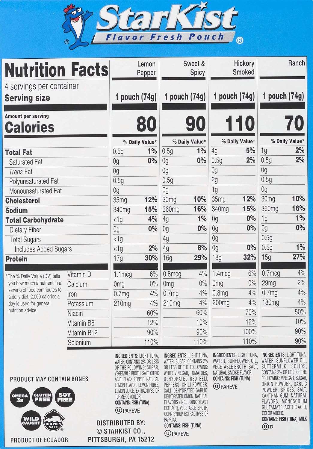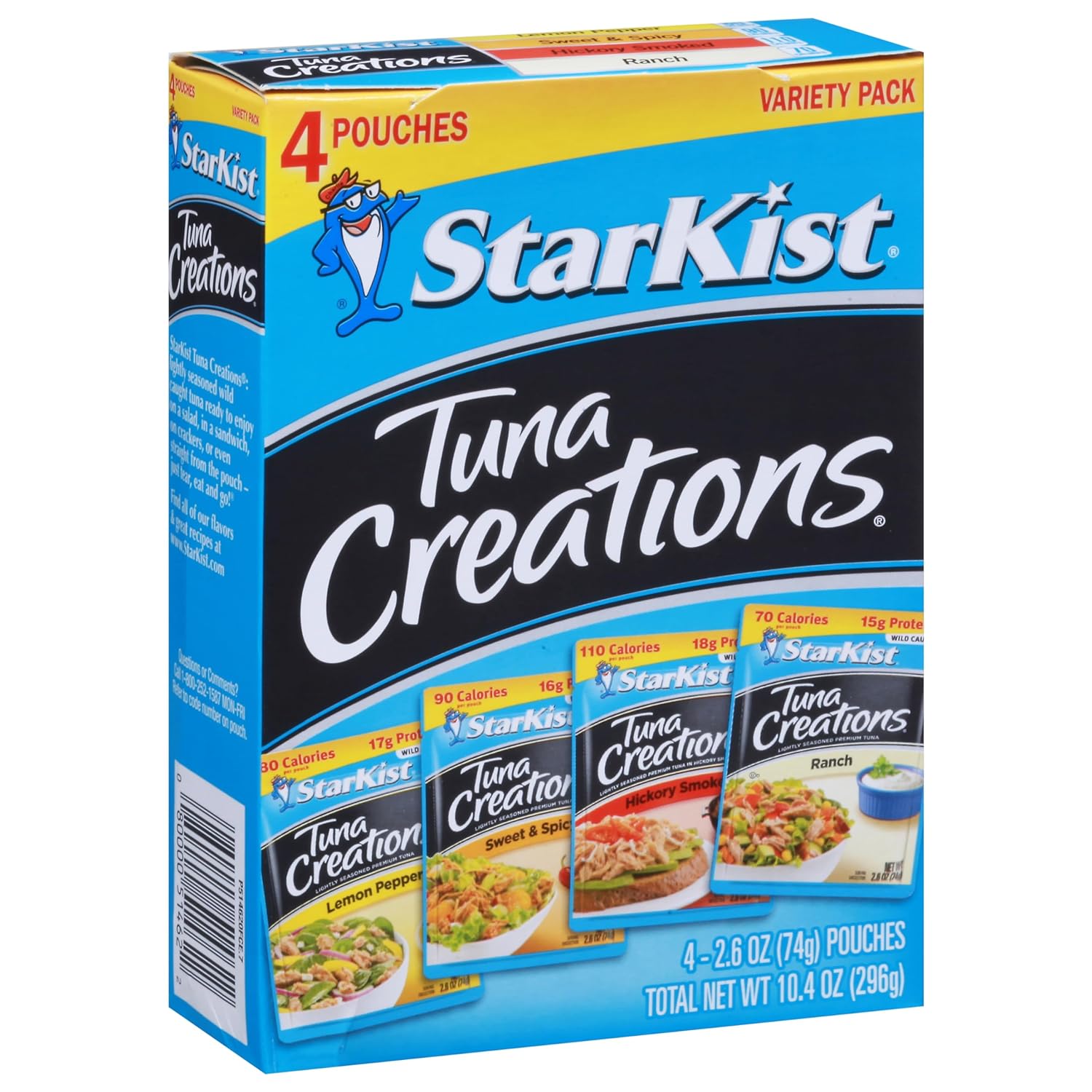 DELICIOUS FLAVORS: This 4-pack of StarKist Tuna Creations includes one 2.6 oz pouch of each flavorful variety: Lemon Pepper, Sweet & Spicy, Hickory Smoked, and Ranch. You can enjoy lightly seasoned wild caught tuna, anywhere, anytime!10EXCELLENT SOURCE OF PROTEIN: Our wild caught tuna is a natural source of Omega 3s, plus each flavor has 15g+ of lean protein per serving (see pouch for complete nutritional information). All pouches are Soy Free, Gluten Free and Dolphin safe10ADD VARIETY TO YOUR DIET: Tuna is a wholesome choice for a snack or meal. StarKist Tuna Creations Variety Pack is lightly seasoned wild caught tuna that is ready to enjoy on a salad, in a sandwich, on crackers, or even straight from the pouch!10FLAVOR FRESH POUCHES: Our flavor fresh tuna pouch preserves the freshness of your favorite meal or snack, so it’s always delicious and ready when you are – just tear, eat, and go!10PACK OF 4: This StarKist Tuna Creations Variety Pack provides you with four tasty flavors in pouches that are easy to store and great to have handy for when hunger strikes – whether you’re on the go, at the office or at home10Can’t decide which flavor of StarKist Tuna Creations variety you want? Then fret no more! This StarKist Tuna Creations Variety Pack includes one 2.6 oz of each flavorful variety: Lemon Pepper, Sweet & Spicy, Hickory Smoked, and Ranch. Whether you’re squeezing in lunch between meetings during a busy workday or want a quick, protein-packed snack between soccer practice, school and other daily errands, StarKist Tuna Creations is the perfect choice! These 2.6 oz pouches start with our premium lightly seasoned wild caught tuna and are the perfect addition to salads, sandwiches, pasta, or even straight out of the pouch. Plus, these nutrient dense tuna pouches are soy free and gluten free and work well with Mediterranean and Weight Watchers diet plans! Our flavor fresh tuna pouch preserves the freshness of your favorite meal or snack, so it’s always delicious and ready when you are. There’s no can opener required or draining necessary – just tear, eat, and go! This packaged tuna is an excellent, natural source of Omega 3s, plus each flavor has 15g+ of lean protein and 110 calories or less per serving (see pouch for complete nutritional information). Tuna is naturally lower in fat and cholesterol, so it’s a wholesome way to add variety to your meals. An industry innovator, StarKist was the first brand to introduce StarKist single-serve pouch products, which include Tuna, Salmon and Chicken Creations, and StarKist Selects E.V.O.O. As America’s favorite tuna*, StarKist represents a tradition of quality, consumer trust and a commitment to sustainability. *Nielsen Custom Scantrak Data xAOC Dollar Share Latest 52 Weeks