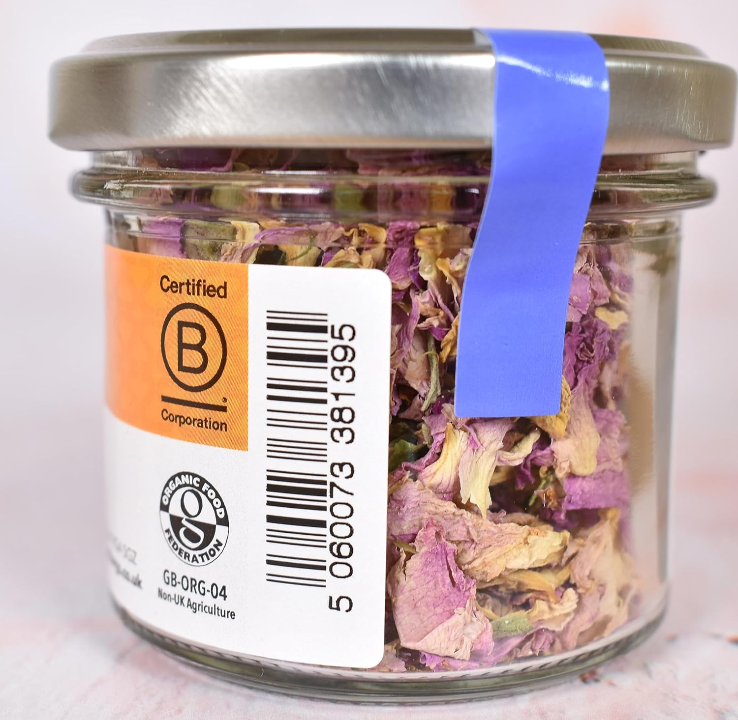 Steenbergs organic pink rose petals are perfect for a variety of culinary uses including rose petal jam and the Moroccan dish Ras al hanout or just sprinkle them on salads or in rice for the added flavour, perfume and pleasure of using them. Of course, you can always use Steenbergs organic rose petals for alternatives to cooking - they are a real pleasure just to look at and smell the heady fragrance. You could even use the organic rose petals to decorate cupcakes - the list is endless. Rose buds are generally picked from the damask rose, Rosa damascena, which is the type used for making rose oil and rose water as well due to its heady rose aroma. Roses are hardy deciduous shrubs, which have arching prickly stems. Damask rose plants grow to 2 metres high (7ft) and produce clusters of semi-double fragrant pink flowers. Rosebuds and rose petals are picked in early summer in the morning when they have fullest aroma and flavour and then are either dried or use to make rose oil or rose water. There is very little volatile oil (less than 1%) in rose petals so the aroma and flavour is truly subtle. The flavour of rose petals are floral and perfumed, and altogether very pleasing. Roses and rose water are seldom used in European cooking, although they were very popular in previous centuries. Rose remains, however, a popular ingredient in Arabic cooking and through into India, being known in the UK for its use in flavouring Turkish delight or in ras al hanut, the trendy North African spice mix. In India, ground rose buds are used to marinade kormas or in desserts like rose flavoured kheer. In Tunisia, rose petals are used to flavour roast meats or in couscous recipes and for flavouring meatballs. We find that rose petals work really well with fruits like apricots or carrots and in trice or desserts. Good examples are Rose Water Ice Cream, Korma Narendra Shahi, Royal Lamb Korma, Tunisian Meatballs In Tomato Sauce,Steenbergs Organic Rose Petals 6g,Edible flowers from Bulgaria,Glass Jar,Steenbergs is The Sustainable Spice Company, based in North Yorkshire, UK