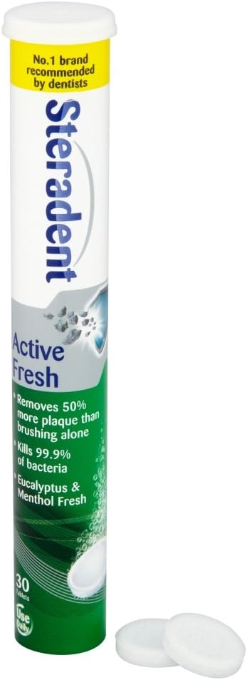 All in One formula activates thousands of micro bubbles around the denture killing 99.9 percent of bacteria. It provides a powerful in depth clean removing 50 percent more plaque than brushing alone. Steradent active fresh tablets will leave your dentures feeling clean with the freshness of eucalyptus and menthol. Suitable for full and partial dentures as the formula is safe to use with your dentures and will not cause damage to metal parts,No. 1 brand recommended by dentists,Removes 50% more plaque than brushing alone,Kills 99.9% of bacteria