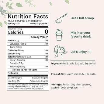 About this item Stevia Erythritol Blend - Plant-based Sweetener Powder, 4 Pounds, Value Size - 4g Per Serving (1Tsp), 453.5 Servings in Total. Natural Sweetener - Highly Purified Stevia Powder with over 98% Rebaudioside A Proprietary Blend with Plant-based Erythritol Granules, Bitter After Taste Reduced, Keto Diet, Low Carb, Sugar Substitute for Baking, Drinks, Smoothie, Coffee etc... No GMOs, No Additives, No Preservatives, No Fillers, No Artificial Colors, No Flavor, No soy, and No Gluten Scoop included getting the measurement every time. Take it daily with or between meals by adding it to a shake or smoothie, see what the most nutrient-dense food on the planet is all about. Powder lover Take it naturally in powder for higher concentration, quicker absorption. › See more product details,Stevia Erythritol Blend - Plant-based Sweetener Powder, 4 Pounds, Value Size - 4g Per Serving (1Tsp), 453.5 Servings in Total,Natural Sweetener - Highly Purified Stevia Powder with over 98% Rebaudioside A Proprietary Blend with Plant-based Erythritol Granules, Bitter After Taste Reduced, Keto Diet, Low Carb, Sugar Substitute for Baking, Drinks, Smoothie, Coffee etc,No GMOs, No Additives, No Preservatives, No Fillers, No Artificial Colors, No Flavor, No soy, and No Gluten,Scoop included getting the measurement every time. Take it daily with or between meals by adding it to a shake or smoothie, see what the most nutrient-dense food on the planet is all about,Powder lover Take it naturally in powder for higher concentration, quicker absorption