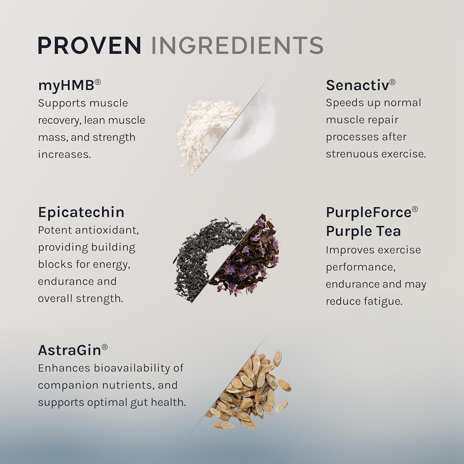 Bioactive Synergy - These muscle recovery supplements tap SenactivĀ® to help support mitochondrial function for healthy recovery, while AstraGinĀ® boosts nutrient absorption by enhancing intestinal transport and barrier integrity