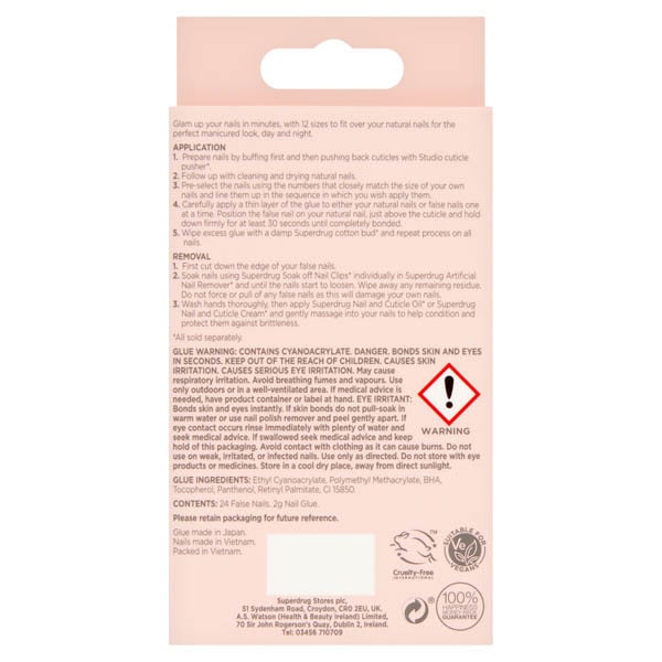 Product Information:Glam Up Your Nails In Minutes, With 12 Sizes To Fit Over Your Natural Nails For The Perfect Manicured Look Day &Amp; Night,Features:Contents: 24 Nails, 2G Nail Glue, Double-Ended Manicure Stick And Application Tool,Warning Or Restrictions:Glue Warning: Contains Cyanoacrylate. Danger. Bonds Skin And Eyes In Seconds. Keep Out Of The Reach Of Children. Causes Skin Irritation. Causes Serious Eye Irritation. May Cause Respiratory Irritation. Avoid Breathing Fumes And Vapours. Use Only Outdoors Or In A Well-Ventilated Area. If Medical Advice Is Needed, Have Product Container Or Label At Hand,Product Specification:Glue Ingredients: Ethyl Cyanoacrylate. Polymethyl Methacrylate, Bha, Tocopherol, Panthenol, Retinyl Palmitate, Ci 15850,Product Uses:Application 1. Prepare Nails By Buffing First And Then Pushing Back Cuticles With *Superdrug Cuticle Pusher. 2. Follow Up With Cleaning And Drying Natural Nails 3. Pre-Select The Nails Using The Numbers That Closely Match The Size Of Your Own Nails And Line Them Up In The Sequence In Which You Wish Apply Them. 4.Carefully Apply A Thin Layer Of The Glue To Either Your Natural Nails Or The False Nails One At A Time, Wiping Away Any Excess With A Damp Superdrug Cotton Bud*. 5. Using The Application Tool Provided, Position The Artificial Nail On Your Natural Nail, Just Above The Cuticle And Hold Down Firmly For At Least 30 Seconds Until Completely Bonded. Repeat On All Nails. Removal 1. First Cut Down The Edge Of Your Artificial Nails. 2. Soak Nails Individually In Superdrug Artificial Nail Remover Until The Nails Start To Dissolve. Wipe Away Any Remaining Residue. Do Not Force Or Pull Of Any False Nails As This Will Damage Your Own Nails. 3. Wash Hands Thoroughly, Then Apply Superdrug Cuticle Oil* Or Superdrug Cuticle Cream* And Gently Massage Into Your Nails To Help Keep Condition And Protect Them Against Brittleness. *All Sold Sepertatley,Recyclable:Box Widely Recycled Insert Widely Recycled Bottle Widely Recycled