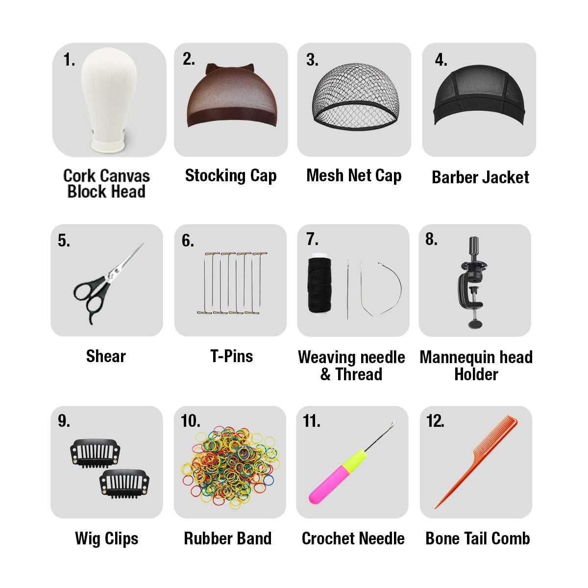 Studio Limited Polyurethane Canvas Block Head DIY Wig Making Starter Kit 12pcs, PU Mannequin Head Wig Display and Stand for Wig Styling (24" Set)