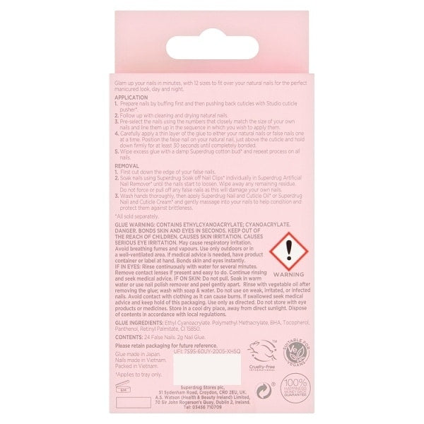 Glam Your Nails In Minutes, With 12 Sizes To Fit Over Your Natural Nails For The Perfect Manicured Look, Day And Night. Application 1.Prepare Nail By Buffing First And Then Pushing Back Cuticles With The Manicure Stick Provided. 2.Follow Up With Cleaning And Drying Natural Nails. 3. Pre-Select The Nails Using The Numbers That Closely Match The Size Of Your Own Nails And Line Them Up In The Sequence In Which You Wish Apply Them. 4.Carefully Apply A Thin Layer Of The Glue To Either Your Natural Nails Or False Nails One At A Time. Position The False Nail On Your Natural Nail, Just Above The Cuticle And Hold Down Firmly For At Least 30 Seconds Until Completely Bonded. 5.Wipe Excess Glue With A Damp Superdrug Cotton Bud* And Repeat Process On All Nails. Removal 1.First Cut Down The Edge Of Your Artificial Nails. 2.Soak Nails Using Superdrug Soak Off Nail Clips* Individually In Superdrug Artificial Nail Remover*Until The Nails Start To Loosen. Wipe Away Any Remaining Residue. Do Not Force Or Pull Off Any False Nails As This Will Damage Your Own Natural Nails. 3.Wash Hands Thoroughly, Then Apply Superdrug Nail And Cuticle Oil* Or Superdrug Nail Cuticle Cream* And Gently Massage Into Your Nails To Help Condition And Protect Them Against Brittleness. * All Sold Separately
