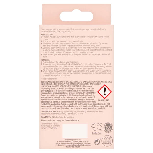 Product Information:Glam Up Your Nails In Minutes, With 12 Sizes To Fit Over Your Natural Nails For The Perfect Manicured Look Day &Amp; Night,Features:Contents: 24 Nails, 2G Nail Glue, Double-Ended Manicure Stick And Application Tool,Warning Or Restrictions:Glue Warning: Contains Cyanoacrylate. Danger. Bonds Skin And Eyes In Seconds. Keep Out Of The Reach Of Children. Causes Skin Irritation. Causes Serious Eye Irritation. May Cause Respiratory Irritation. Avoid Breathing Fumes And Vapours. Use Only Outdoors Or In A Well-Ventilated Area. If Medical Advice Is Needed, Have Product Container Or Label At Hand,Product Specification:Glue Ingredients: Ethyl Cyanoacrylate. Polymethyl Methacrylate, Bha, Tocopherol, Panthenol, Retinyl Palmitate, Ci 15850,Product Uses:Application 1. Prepare Nails By Buffing First And Then Pushing Back Cuticles With *Superdrug Cuticle Pusher. 2. Follow Up With Cleaning And Drying Natural Nails 3. Pre-Select The Nails Using The Numbers That Closely Match The Size Of Your Own Nails And Line Them Up In The Sequence In Which You Wish Apply Them. 4.Carefully Apply A Thin Layer Of The Glue To Either Your Natural Nails Or The False Nails One At A Time, Wiping Away Any Excess With A Damp Superdrug Cotton Bud*. 5. Using The Application Tool Provided, Position The Artificial Nail On Your Natural Nail, Just Above The Cuticle And Hold Down Firmly For At Least 30 Seconds Until Completely Bonded. Repeat On All Nails. Removal 1. First Cut Down The Edge Of Your Artificial Nails. 2. Soak Nails Individually In Superdrug Artificial Nail Remover Until The Nails Start To Dissolve. Wipe Away Any Remaining Residue. Do Not Force Or Pull Of Any False Nails As This Will Damage Your Own Nails. 3. Wash Hands Thoroughly, Then Apply Superdrug Cuticle Oil* Or Superdrug Cuticle Cream* And Gently Massage Into Your Nails To Help Keep Condition And Protect Them Against Brittleness. *All Sold Sepertatley,Recyclable:Box Widely Recycled Insert Widely Recycled Bottle Widely Recycled