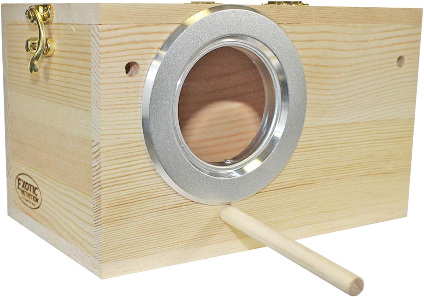 Exotic Nutrition's Sturdy Nest Box encourages natural instincts used in the wild, providing a safe & secure place to nest. Dimensions : 7.75 L X 4.75 W X 4.75 H. Opening - 2" Diameter FEATURES : NATURAL - Mimics the natural nesting techniques exercised in the wild EASY ACCESS - Top opens on a hinge for easy access for easy cleaning and to view or remove your pet. EASY TO INSTALL - Attached hardware (included) allows for easy mounting to any cage. NESTING - Add some nesting material and watch your pet build a natural nest or provide a warm, fleece nesting pouch to use inside the box! MOUNTING INSTRUCTIONS : Mount the box higher in your pet's cage in the top corner if possible. Make sure your pet can always easily enter the box by setting up a wood platform below, or mount next to side of cage. The wooden post will come detached inside the box and can be inserted into a pre-drilled hole at the front of the box. It is suggested to use super glue to permanently mount the post into place. When used for breeding, mount closer to bottom of cage in case babies come out and need to find their way back