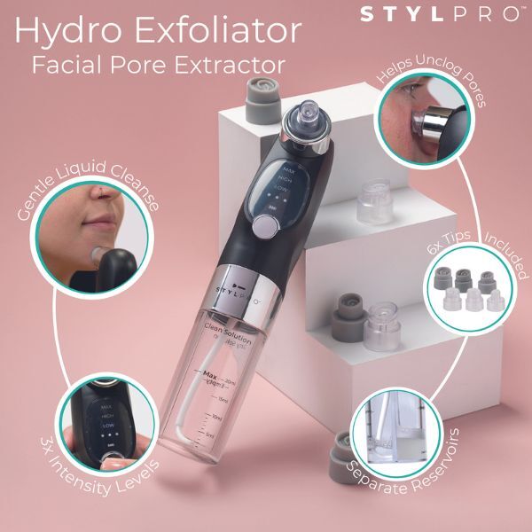 The Stylpro Hydro Exfoliator Is A Compact Device That Uses A Liquid Solution And Gentle Vacuum Technology To Unclog Pores, Remove Excess Oils And Eliminate Makeup Residue, Leaving Your Skin Refreshed And Revitalised