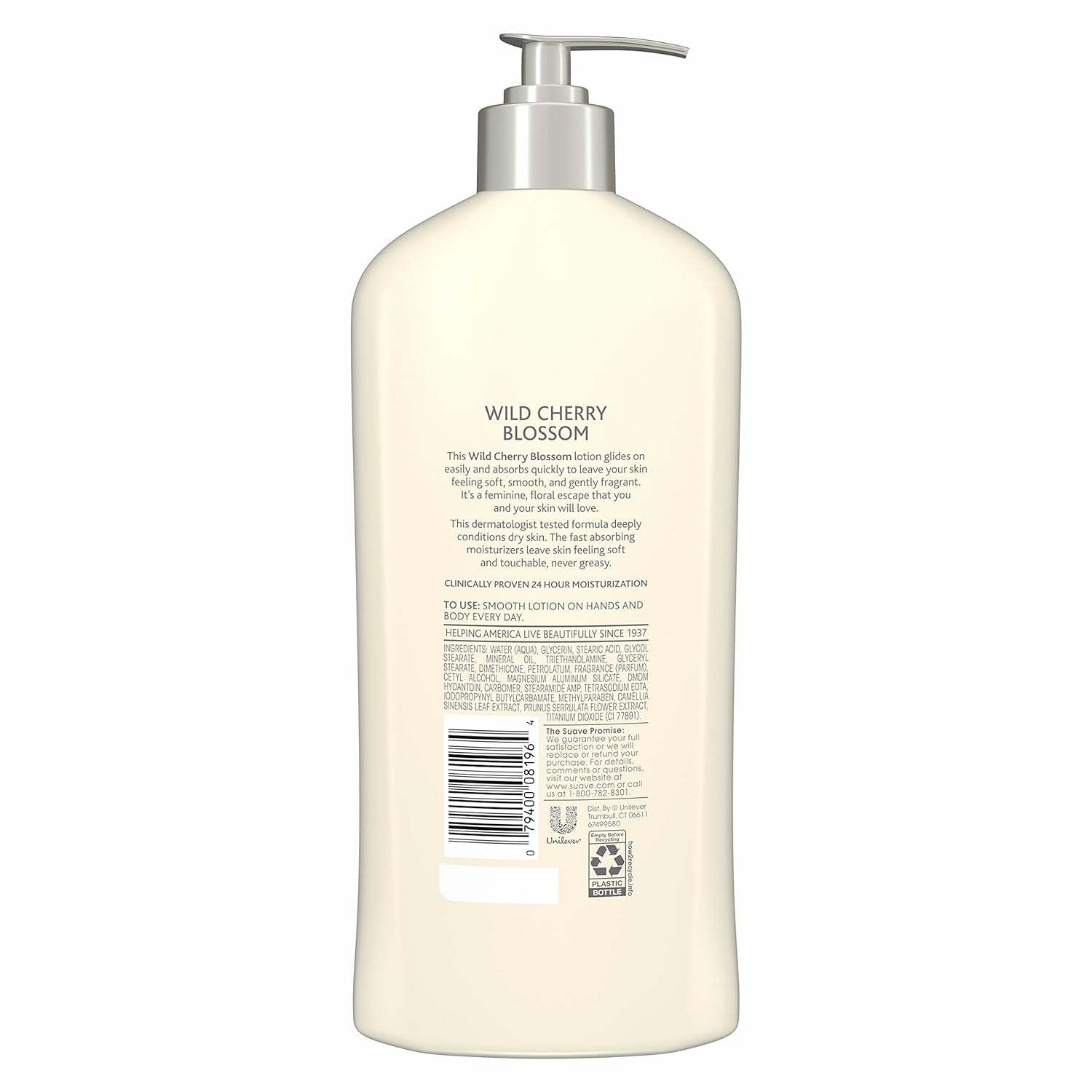 HYDRATING BODY LOTION: Suave Softening Lotion Wild Cherry Blossom deeply hydrates for noticeably soft, smooth, and healthy-looking skinCAPTIVATING FLORAL FRAGRANCE: Our lotion is infused with a light wild cherry blossom floral scent and glides on your skin to rejuvenate and beautifyDERMATOLOGIST-TESTED MOISTURE: Our dermatologist-tested body lotion provides clinically proven 24-hour moisturization that quickly absorbs into your skin for smooth, non-greasy skinFOR BEST RESULTS: Smooth lotion on hands and body every day after showering, bathing, or whenever your skin feels dryABOUT US: For more than 75 years, Suave's mission has been to make quality products so everyone can look and feel good every daySuave Body Lotion for Women - Wild Cherry Blossom Light Floral Scent, Lotion for Dry Skin, Paraben-Free Moisturizing Body Lotion, 18 Oz Ea (Pack of 2)
