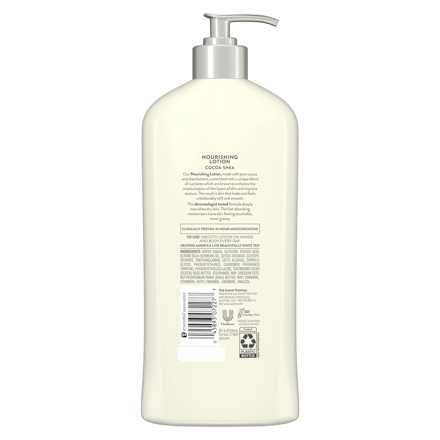 Suave Smoothing with Cocoa Butter & Shea Body Lotion is a lotion with cocoa butter and Shea that provides 24 hour moisturizationSuave Smoothing Cocoa Butter and Shea Lotion softens rough, dry skinInstantly relieves drynessClinically proven moisturizationFor skin that looks and feels unbelievably soft and smoothProduct Description Clinically Proven to moisturize as well as L'occitane Shea Butter Extra-Gentle Lotion. Our Suave Skin Solutions Smoothing Body Lotion with Cocoa Butter & Shea is enriched with a mix of nutrients, which are known to enhance the moisturization of the layers of skin and improve texture. The result is a skin that looks and feels unbelievably soft and smooth. This dermatologist tested moisturizer instantly relieves dryness to soften rough, dry skin and replenishes moisture to make your skin look and feel beautifully smooth. HOW TO USE For unbelievably soft and smooth skin, apply a generous amount with fingertips, and massage in gently with a soothing, circular motion. There's a Suave for every skin need. Suave Skin Solutions Body Lotions are designed to moisturize as well as premium skin care variants and provide 24 hour moisturization benefits. See each pack for more details. Choose from our wide range of moisturizing lotions that best caters to your skin care needs : Advanced Theapy for severely dry skin, Smoothing with Cocoa Butter and Shea, Soothing with Aloe, revitalizing with Vitamin E and Silkening with Baby Oil. Enjoy beautiful soft skin every day with Suave. What's in the Box Suave Skin Solutions Smoothing with Cocoa Butter & Shea Body Lotion, 18 Fluid Ounces. From the Manufacturer Suave Skin Therapy Cocoa Butter with Shea Moisturizer, enriched with nature's moisturizers cocoa and shea butters, this special formula smoothes and softens rough dry skin. Smoothies flaking skin, firms skin to improve tone. Never greasy formula absorbs quickly & easily into skin