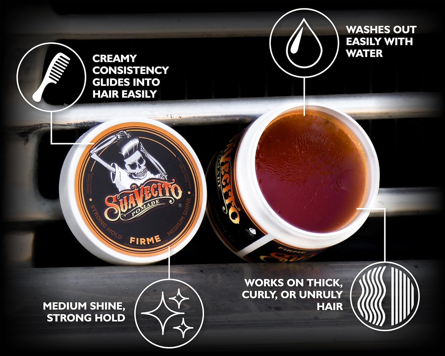 Suavecito Pomade Firme (Strong) Hold - Strong Hold Hair Pomade For Men - Medium Shine Water Based Flake Free Hair Gel - Easy To Wash Out - All Day Hold For All Hair Styles