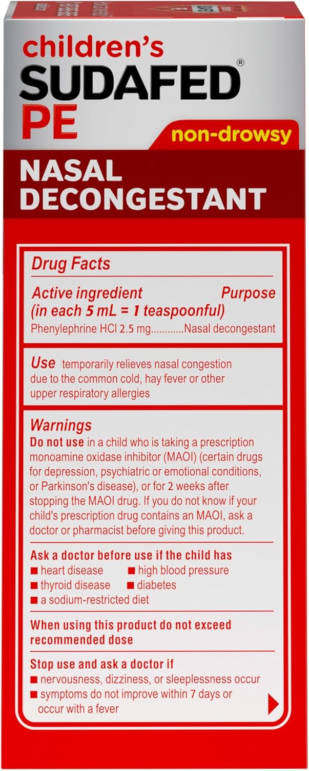 About this item 4-fluid ounces of Children's Sudafed PE Nasal Decongestant provides temporary relief for children's nasal congestion and sinus pressure due to the common cold and hay fever Non-drowsy nasal decongestant formula that is alcohol-free and sugar-free and includes the active ingredient of phenylephrine HCl as a nasal decongestant Find both sinus pressure and nasal congestion relief with this cold medicine for kids ages 4-11 with a non-drowsy formula Non-drowsy relief of nasal congestion from the common cold and allergies in a kid-friendly berry flavor suitable for ages 4 to 11 Cold medicine for kids ages 4-11 in a 4-fluid ounce bottle to help relieve both sinus pressure and nasal congestion See more product details,4-fluid ounces of Children's Sudafed PE Nasal Decongestant provides temporary relief for children's nasal congestion and sinus pressure due to the common cold and hay fever,Non-drowsy nasal decongestant formula that is alcohol-free and sugar-free and includes the active ingredient of phenylephrine HCl as a nasal decongestant,Find both sinus pressure and nasal congestion relief with this cold medicine for kids ages 4-11 with a non-drowsy formula,Non-drowsy relief of nasal congestion from the common cold and allergies in a kid-friendly berry flavor suitable for ages 4 to 11,Cold medicine for kids ages 4-11 in a 4-fluid ounce bottle to help relieve both sinus pressure and nasal congestion