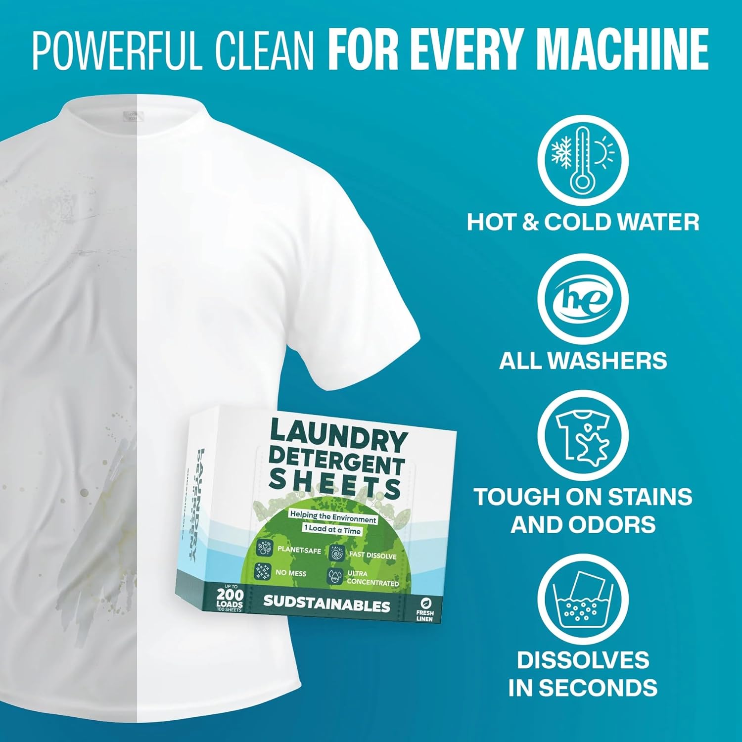 Sudstainables Laundry Detergent Sheets (200 Loads) β Eco-Friendly, Zero Waste, Plastic-Free Laundry Washing Machines Soap Sheets; Dissolvable, Space-Saving Strips For Travel (Fresh Linen)