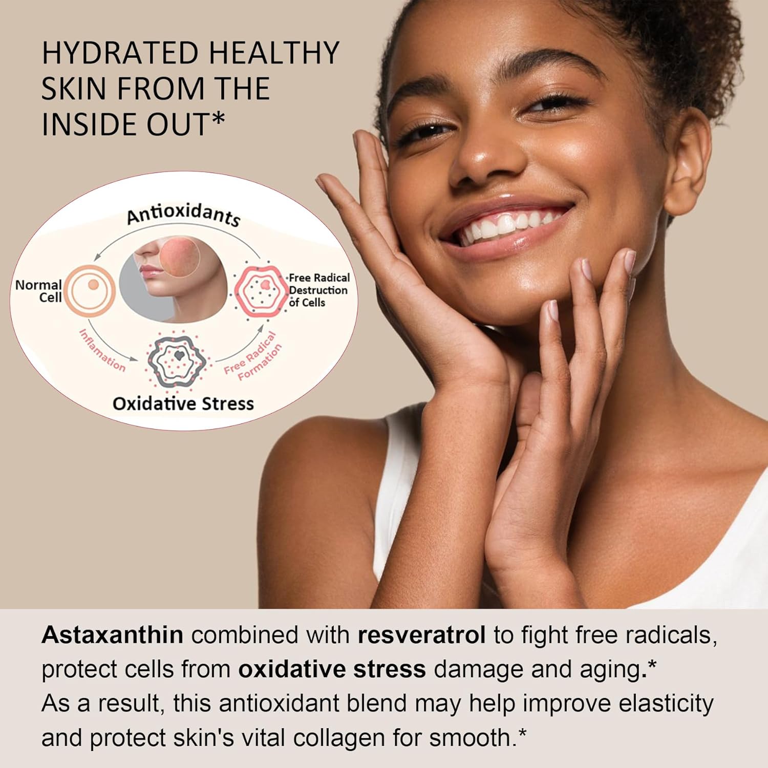 Powerful Antioxidants and Skin Health: Astaxanthin is one of the most powerful natural antioxidants, helping to protect cells from free radical damage and also stimulating collagen production, while the added 500mg of Resveratrol is a powerful combination of antioxidants that help scavenge oxidation-generated free radicals and support overall skin health