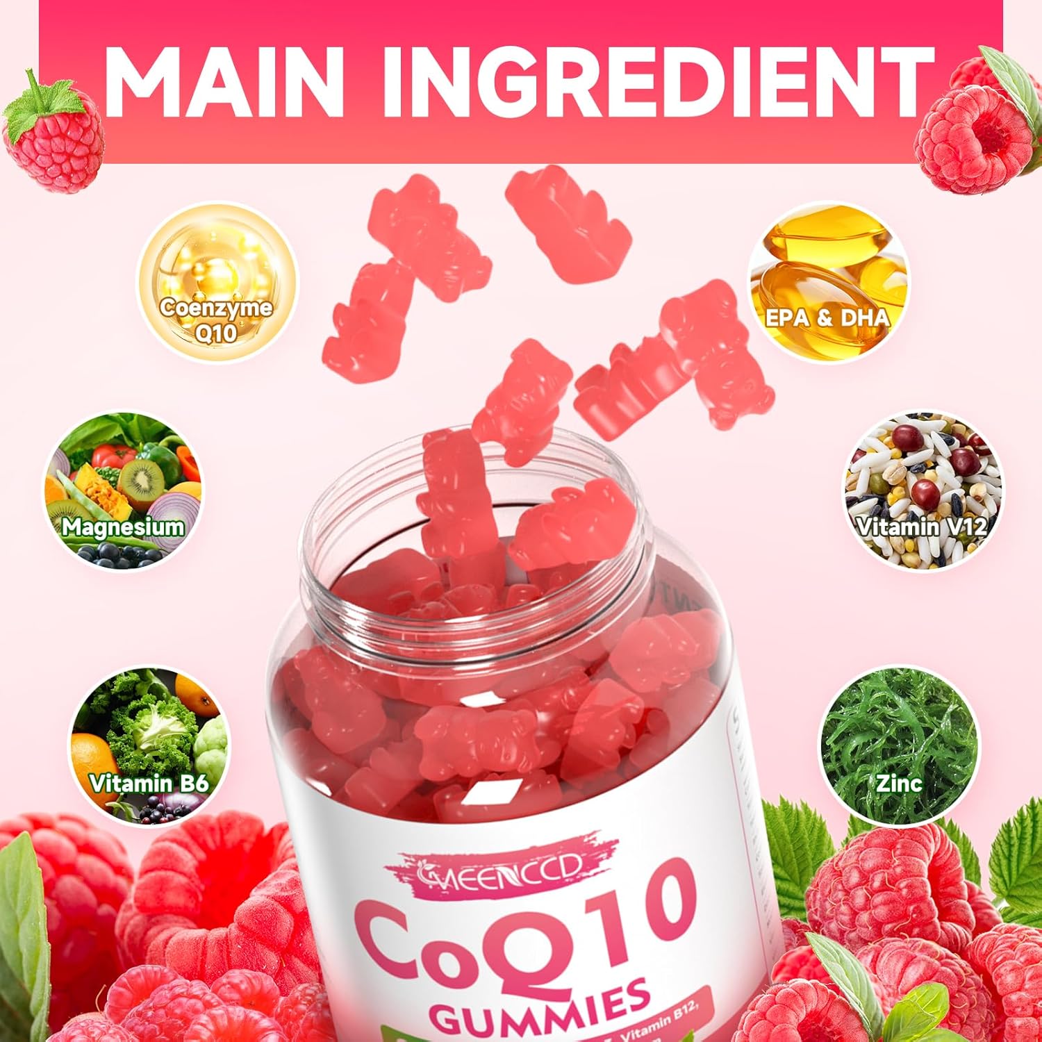 About this item Premium CoQ10 Gummies: Experience our ultra-premium CoQ10 250mg gummies, crafted with innovative technology for enhanced nutrient absorption. With natural raspberry flavor, these coq10 gummies are a delightful way to support your daily health regimen. Heart & Cellular Energy: Fortified with 250mg CoQ10, Omega-3, Vitamin B6, Vitamin B12, and Zinc, each serving helps maintain heart health and boost cellular energy production. These coq10 gummies are ideal for those seeking a natural approach to healthy aging and vitality. Antioxidant & Immune Support: Packed with antioxidants, our CoQ10 gummies combat free radicals and promote skin health. Zinc Citrate contributes to immune support and collagen synthesis, ensuring a vibrant you. Vegan, Gluten-Free, & Gelatin-Free: Designed for a healthy lifestyle, our coq10 gummies are pectin-based, making them suitable for vegans. They're also free from gluten and gelatin, with plant-derived sweeteners for a guilt-free indulgence. 30-Day Supply, Value & Quality: Get a full 30-day supply in one bottle, each coq10 gummy providing a potent 250mg coenzyme 10 dose. Third-party tested for purity and potency, our coq10 gummies offer the best value without compromising on quality or convenience. See more product details,Premium CoQ10 Gummies: Experience our ultra-premium CoQ10 250mg gummies, crafted with innovative technology for enhanced nutrient absorption. With natural raspberry flavor, these coq10 gummies are a delightful way to support your daily health regimen,Heart & Cellular Energy: Fortified with 250mg CoQ10, Omega-3, Vitamin B6, Vitamin B12, and Zinc, each serving helps maintain heart health and boost cellular energy production. These coq10 gummies are ideal for those seeking a natural approach to healthy aging and vitality,Antioxidant & Immune Support: Packed with antioxidants, our CoQ10 gummies combat free radicals and promote skin health. Zinc Citrate contributes to immune support and collagen synthesis, ensuring a vibrant you,Vegan, Gluten-Free, & Gelatin-Free: Designed for a healthy lifestyle, our coq10 gummies are pectin-based, making them suitable for vegans. They're also free from gluten and gelatin, with plant-derived sweeteners for a guilt-free indulgence,30-Day Supply, Value & Quality: Get a full 30-day supply in one bottle, each coq10 gummy providing a potent 250mg coenzyme 10 dose. Third-party tested for purity and potency, our coq10 gummies offer the best value without compromising on quality or convenience