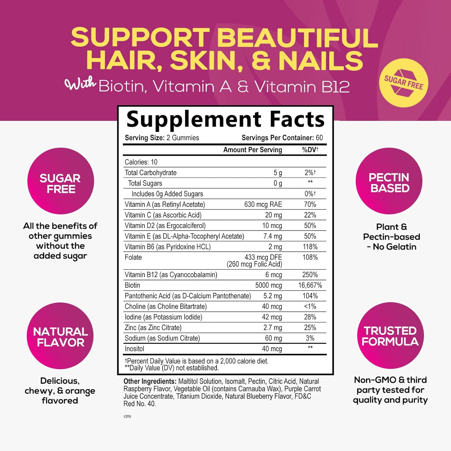 Sugar Free Hair Vitamins Gummies With Biotin 5000 Mcg, Vitamin A, B12,