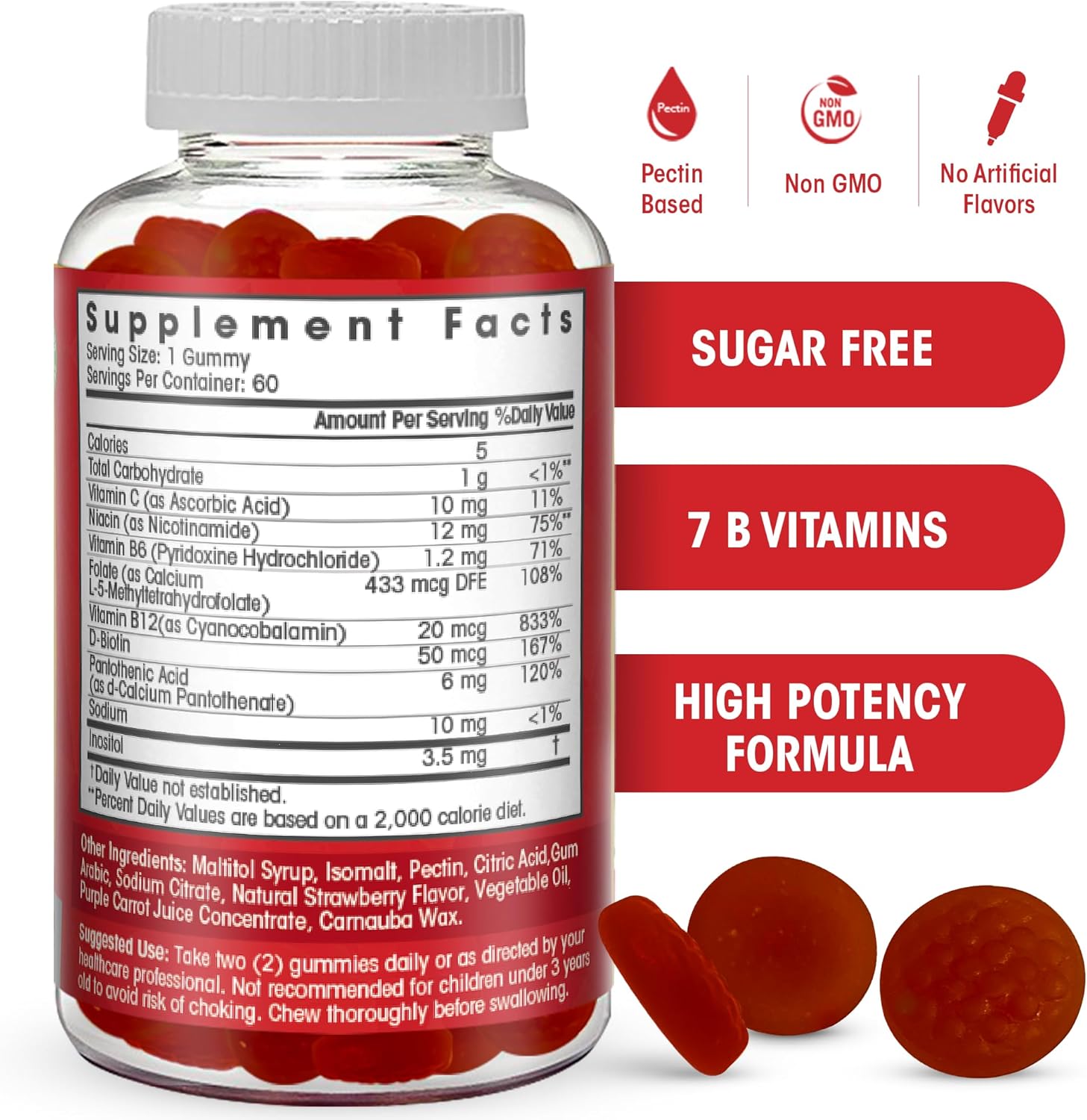 About this item Your favorite B Complex Supplement is now Sugar Free! A Delicious and easy way to get your B complex vitamins: Swallowing pills is a chore. Our strawberry flavored B complex gummies are a delicious, gelatin-free dose of B vitamins: B3 (Niacin), B6 , B7 (Biotin), B9 (Folate) & B12. Our formula is so potent you just need ONE gummy! Great prenatal vitamins: Pregnancy is hard enough without swallowing hard pills, try our delicious, vegan friendly B complex gummies and getting your daily dose of B vitamins will be easy. Helping aging people get their B12 Vitamin: It is recommended that aging and elderly people supplement their diet with a B complex supplement. Just one gummy provides 800% of your B-12 needs. Improve your energy levels and even your hair skin and nails. Vegetarian and vegan friendly: Our gummies are made from fruit-based pectin not gelatin so we can offer vegans and vegetarians an easy (and delicious) way to supplement their diets Third Party Tested, Made in the USA & GMP compliant - Our supplements are made in a GMP compliant facility. Made for women, men & children, ( para mujer y hombre )everyone can benefit from this supplement. See more product details,Your favorite B Complex Supplement is now Sugar Free! A Delicious and easy way to get your B complex vitamins: Swallowing pills is a chore. Our strawberry flavored B complex gummies are a delicious, gelatin-free dose of B vitamins: B3 (Niacin), B6 , B7 (Biotin), B9 (Folate) & B12. Our formula is so potent you just need ONE gummy!,Great prenatal vitamins: Pregnancy is hard enough without swallowing hard pills, try our delicious, vegan friendly B complex gummies and getting your daily dose of B vitamins will be easy,Helping aging people get their B12 Vitamin: It is recommended that aging and elderly people supplement their diet with a B complex supplement. Just one gummy provides 800% of your B-12 needs. Improve your energy levels and even your hair skin and nails,Vegetarian and vegan friendly: Our gummies are made from fruit-based pectin not gelatin so we can offer vegans and vegetarians an easy (and delicious) way to supplement their diets,Third Party Tested, Made in the USA & GMP compliant - Our supplements are made in a GMP compliant facility. Made for women, men & children, ( para mujer y hombre )everyone can benefit from this supplement