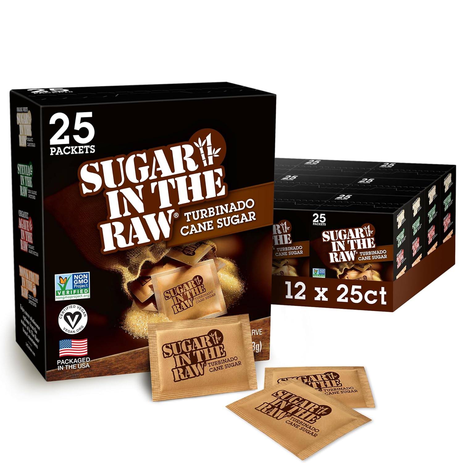 Sugar In The Raw Turbinado Cane Sugar Packets, 25 Ct Box, 12 Pack, Pure, All-Natural Turbinado Sugar, Non-Gmo Project Verified, Kosher, Vegan And Gluten Free