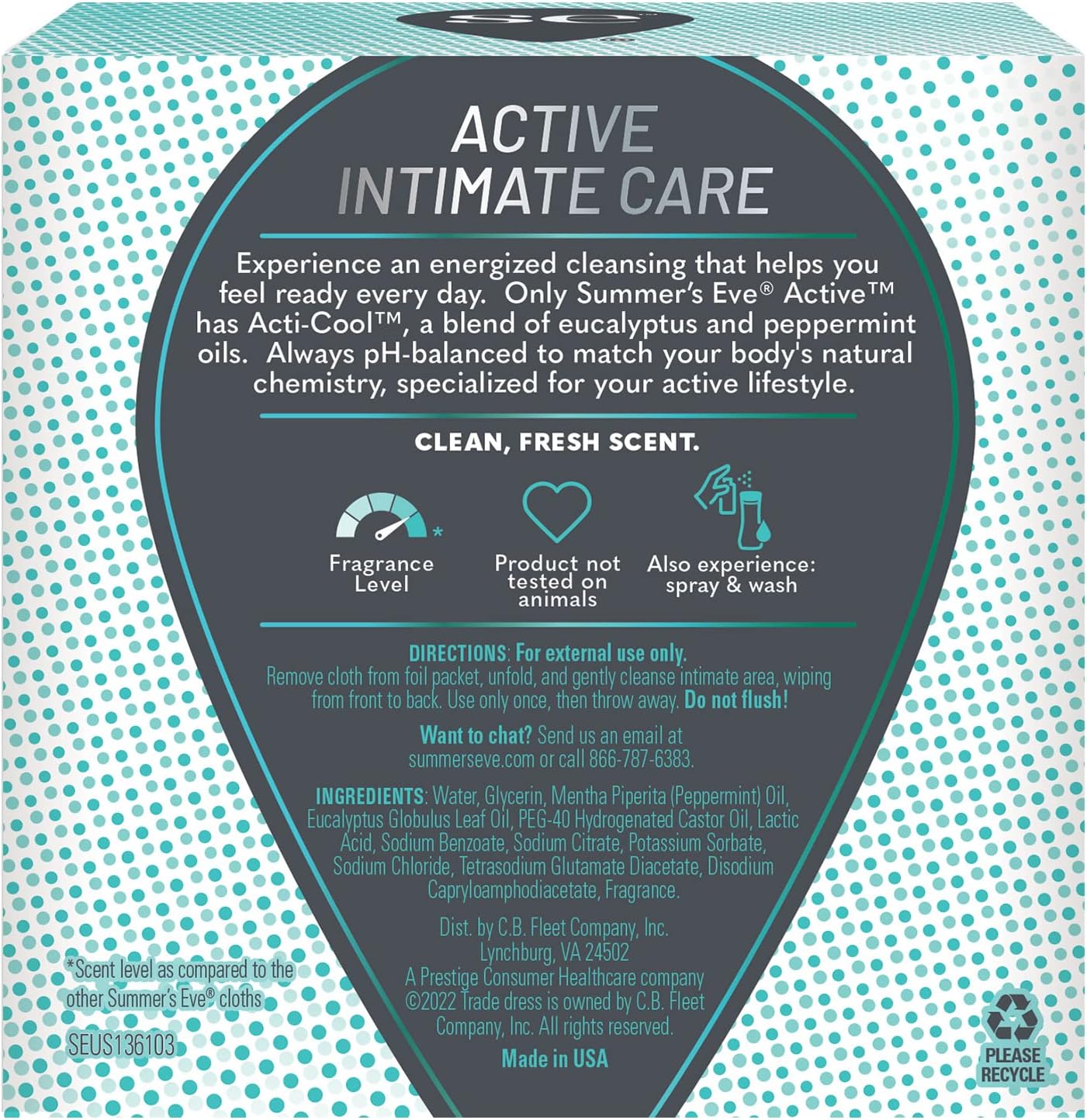 BULLET POINTS : 1 > Summer’s Eve Active daily perfomance feminine wipes remove odor-causing bacteria