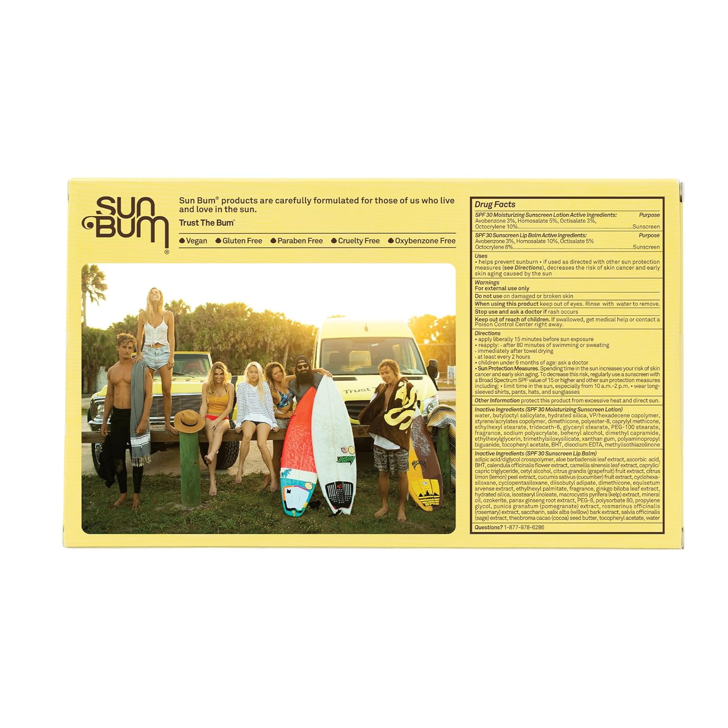 Includes (1) Sun Bum Moisturizing Sunscreen Lotion, SPF 30, 3oz Tube, (1) Sun Bum Sunscreen Lip Balm, Coconut, SPF 30, and (1) Sun Bum Cool Down Hydrating After Sun Lotion, 3oz TubeBroad Spectrum UVA/UVB ProtectionParaben Free / Paba Free / Gluten Free / 100% VeganOil Free / Won't Clog Pores / Anti Aging/ TSA Size ApprovedCruelty Free / Skin Cancer Foundation Approved and RecommendedTRUST THE BUM. What does that mean It means trust us, the ones who live on the beach and need products that work on the most intense days in the sun. The simple truth is, when you make products to protect the ones you love, you make ‘em better