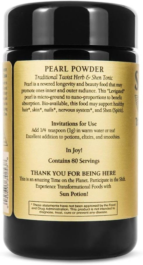 About this item 100% LEVIGATED FRESHWATER PEARL POWDER super finely ground for optimum bioavailability! REVERED SHEN (SPIRIT) TONIC: Pearl is a revered food that has been used for centuries by Taoist Herbalists to support one's inner and outer radiance. It is an excellent source of minerals including calcium, zinc, iron, selenium, and amino acids. INVITATIONS FOR USE: Add ½ tsp. to your elixir of choice, use in raw treats like homemade chocolates and desserts. Beautiful topping to dust on desserts, hot chocolate, lattes. Wonderful to add in face masks for topical application! IN JOY: 100% satisfaction guarantee on Sun Potion adaptogens and tonic herbs. Our products are sourced from around the globe and processed in the USA. We invite you to experience the shift with Sun Potion Transformational Foods. See more product details, 100% LEVIGATED FRESHWATER PEARL POWDER super finely ground for optimum bioavailability!, REVERED SHEN (SPIRIT) TONIC: Pearl is a revered food that has been used for centuries by Taoist Herbalists to support one's inner and outer radiance. It is an excellent source of minerals including calcium, zinc, iron, selenium, and amino acids, INVITATIONS FOR USE: Add ½ tsp. to your elixir of choice, use in raw treats like homemade chocolates and desserts. Beautiful topping to dust on desserts, hot chocolate, lattes. Wonderful to add in face masks for topical application!, IN JOY: 100% satisfaction guarantee on Sun Potion adaptogens and tonic herbs. Our products are sourced from around the globe and processed in the USA. We invite you to experience the shift with Sun Potion Transformational Foods