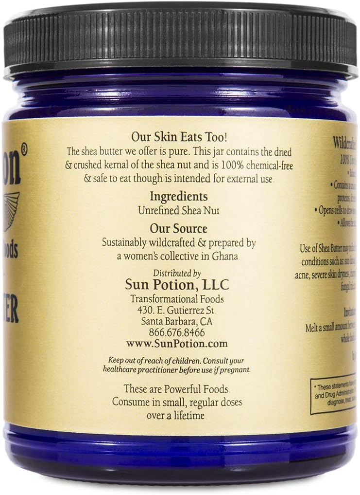 About this item  100% PURE UNREFINED SHEA NUT: Chemical-free. Extracted from the nut of the Shea-Karite tree (commonly found throughout Africa).  BALANCES SKIN pH through a unique profile of minerals, proteins & essential fatty acids.  OPENS CELLS TO DRAW MOISTURE IN: Shea Butter helps your skin to retain its hydration & allows the skin to BREATHE.  INVITATIONS FOR USE: Melt a small amount between palms and apply to whole body, face, and hair. Use on dry lips, cuticles, and other places on the body that can use extra hydration.  IN-JOY: 100% satisfaction guarantee on Sun Potion adaptogens and tonic herbs. Our products are sourced from around the globe and processed in the USA. We invite you to experience the shift with Sun Potion Transformational Foods.  See more product details, 100% PURE UNREFINED SHEA NUT: Chemical-free. Extracted from the nut of the Shea-Karite tree (commonly found throughout Africa), BALANCES SKIN pH through a unique profile of minerals, proteins & essential fatty acids, OPENS CELLS TO DRAW MOISTURE IN: Shea Butter helps your skin to retain its hydration & allows the skin to BREATHE, INVITATIONS FOR USE: Melt a small amount between palms and apply to whole body, face, and hair. Use on dry lips, cuticles, and other places on the body that can use extra hydration, IN-JOY: 100% satisfaction guarantee on Sun Potion adaptogens and tonic herbs. Our products are sourced from around the globe and processed in the USA. We invite you to experience the shift with Sun Potion Transformational Foods