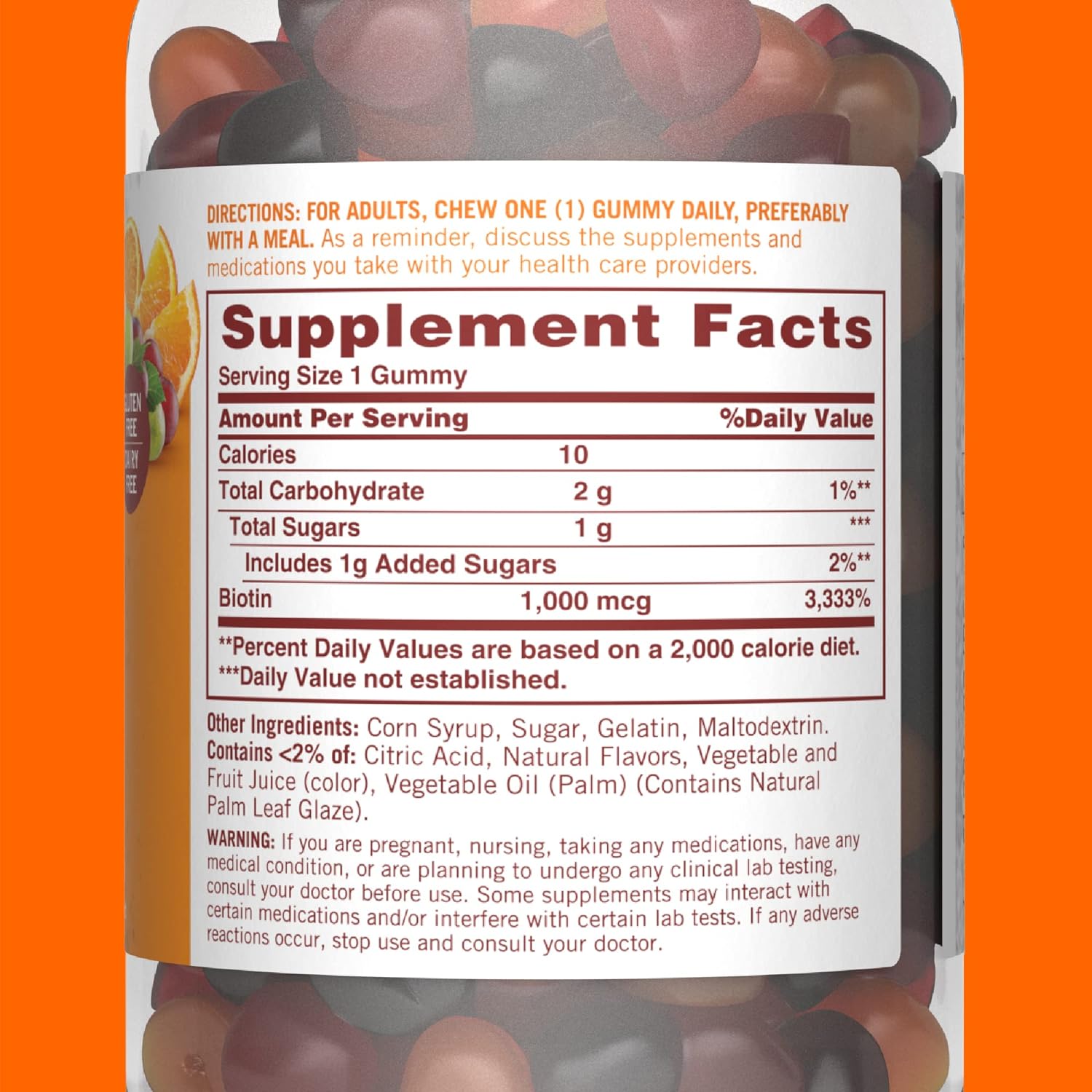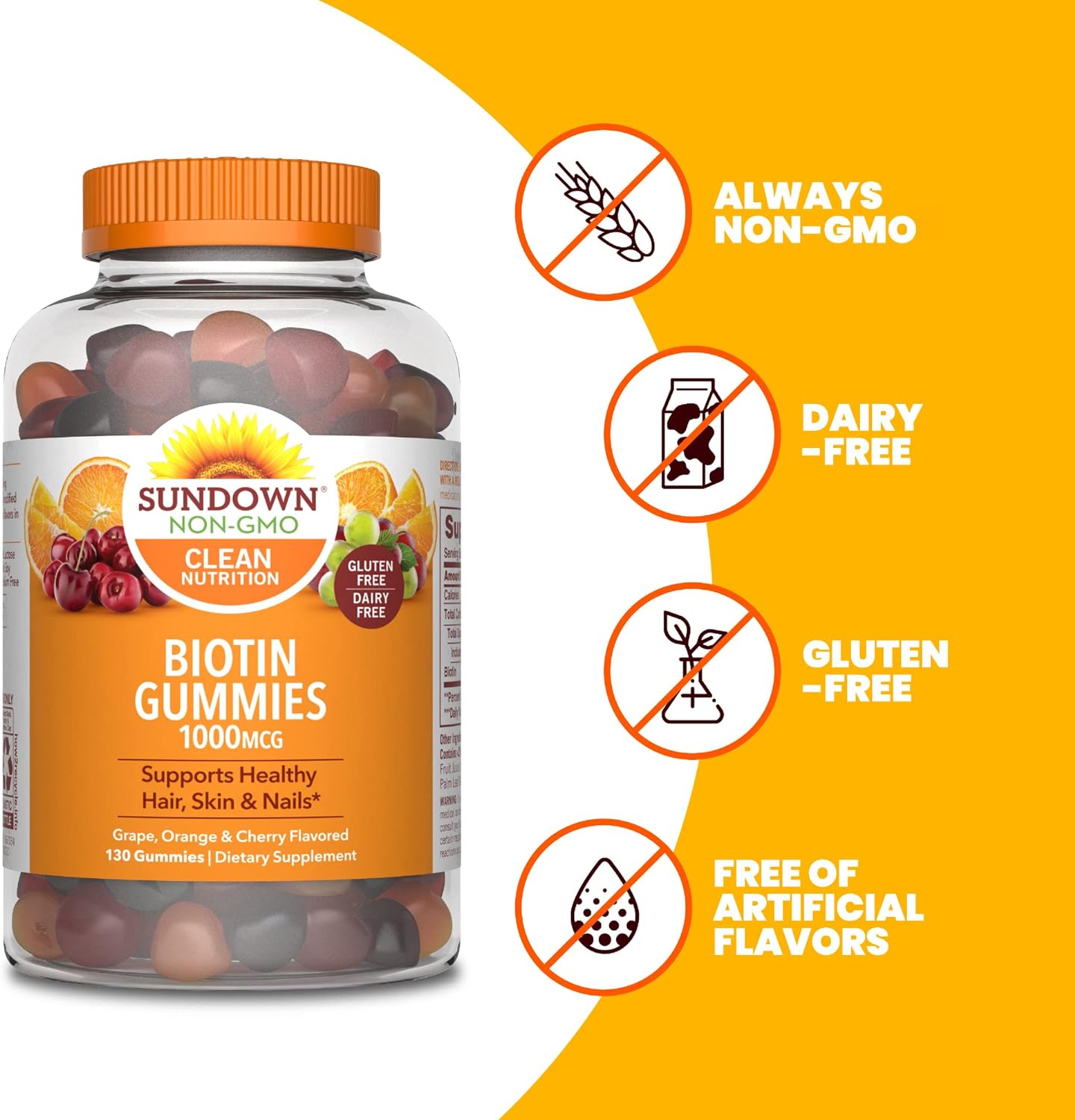 Sundown Biotin Gummies , Supports Healthy Hair, Skin & Nails, Non-Gmo, Free Of Gluten, Dairy, Artificial Flavors, 1000 Mcg, 130 Gummies