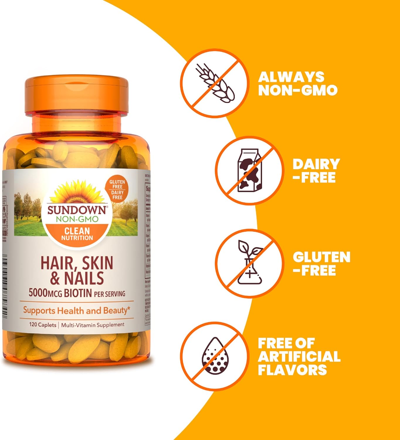 Sundown Hair, Skin And Nails, Biotin 5000 Mcg, 17 Essential Nutrients To Support Health And Beauty, 120 Caplets