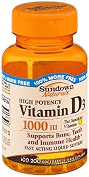 Sundown Naturals High Potency Vitamin D3. 100% more free. 1000IU. The sunshine vitamin. Supports bone, teeth and immune health*. Fast acting liquid softgel! 200 softgels. Vitamin supplement