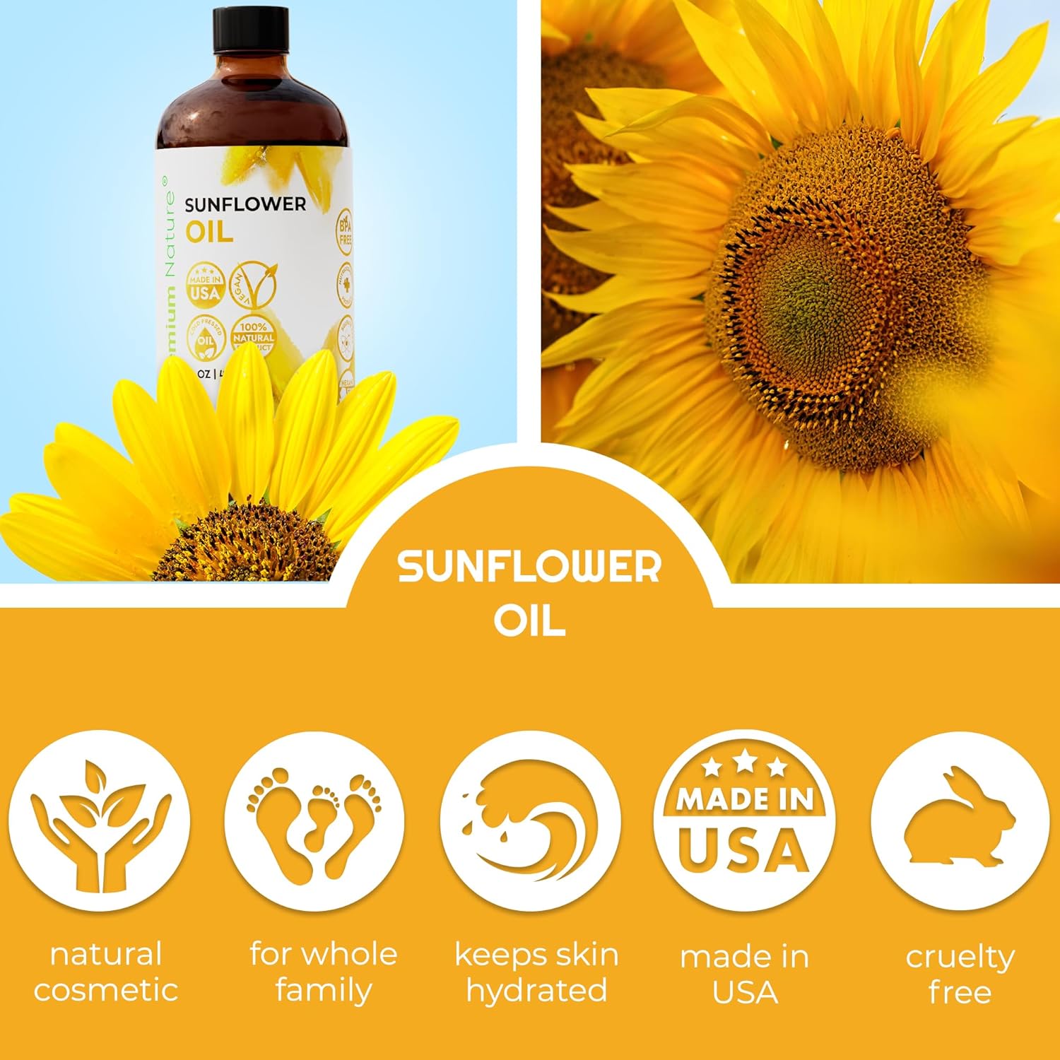 About this item AMAZING FOR YOUR SKIN - Sunflower Oil for skin is rich in Vitamin A and Vitamin E. Sunflower seed oil will promote skin health and help regenerate damaged skin cells. Best carrier oil for essential oils mixing. SOFT, SHINY HAIR - Sunflower Oil for hair helps soften dry, frizzy hair. It adds a gorgeous sheen to your hair and can be used as a conditioner. ANTI-AGING PROPERTIES - Sunflower seed oil can be applied directly to the skin. This skin oil and will fight wrinkles. It's so gentle, it can be used daily. ANTI-INFLAMMATORY - The vitamin E found in sunflower oil is perfect to use for sensitive skin. This oils for skin will improve and moisturize your skin without causing redness. SUN PROTECTION - Sunflower oil for face helps damage caused from the sun and prevents wrinkle formation. It even absorbs energy from UV light and helps prevent dark spots. See more product details,AMAZING FOR YOUR SKIN - Sunflower Oil for skin is rich in Vitamin A and Vitamin E. Sunflower seed oil will promote skin health and help regenerate damaged skin cells. Best carrier oil for essential oils mixing,SOFT, SHINY HAIR - Sunflower Oil for hair helps soften dry, frizzy hair. It adds a gorgeous sheen to your hair and can be used as a conditioner,ANTI-AGING PROPERTIES - Sunflower seed oil can be applied directly to the skin. This skin oil and will fight wrinkles. It's so gentle, it can be used daily,ANTI-INFLAMMATORY - The vitamin E found in sunflower oil is perfect to use for sensitive skin. This oils for skin will improve and moisturize your skin without causing redness,SUN PROTECTION - Sunflower oil for face helps damage caused from the sun and prevents wrinkle formation. It even absorbs energy from UV light and helps prevent dark spots
