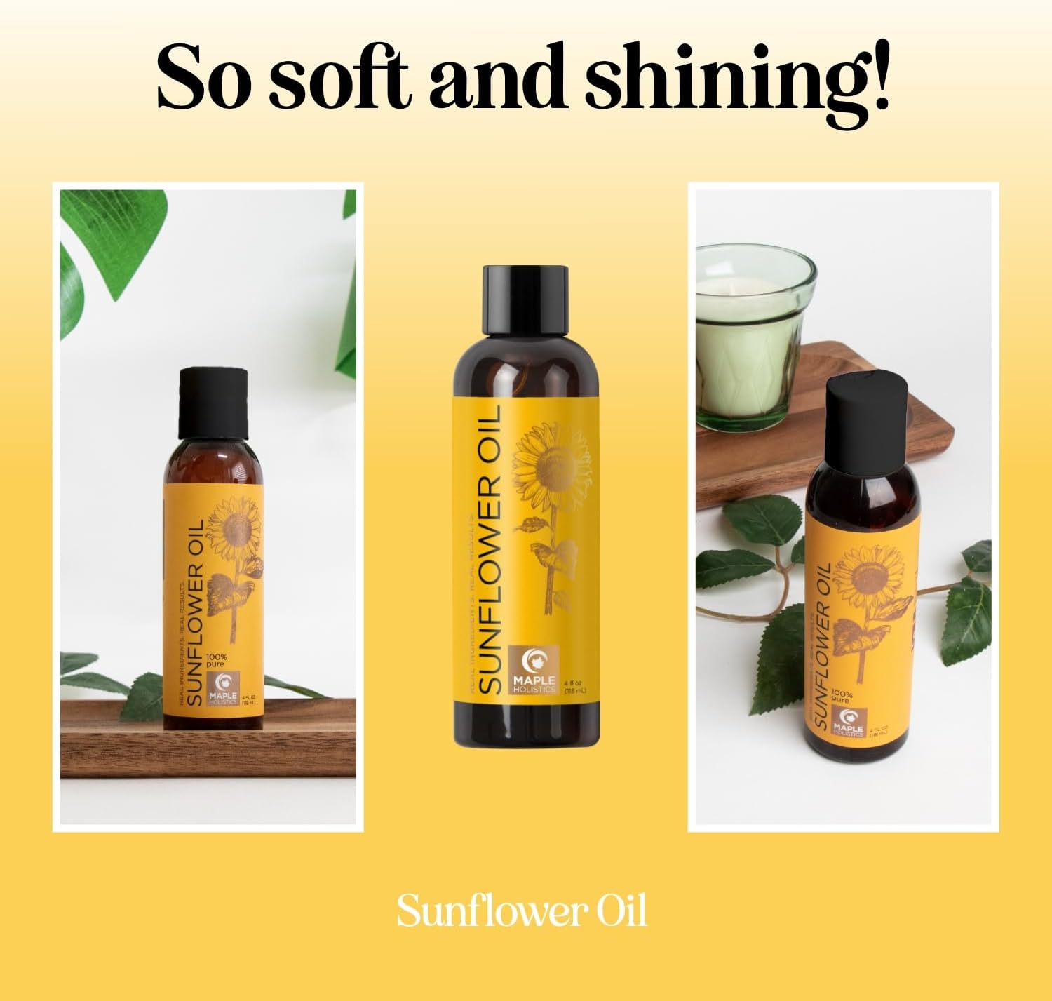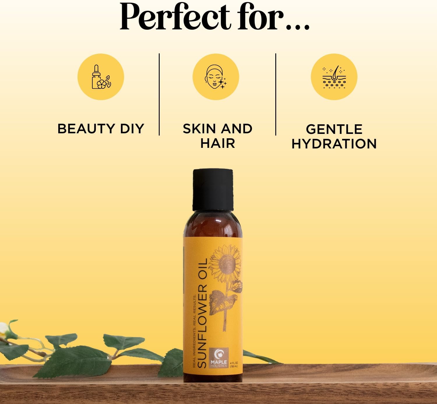 Sunflower Seed Oil for Skin - Try our antioxidant skin oil rich in linoleic acid and oleic acid to lock in moisture for a nourishing humectant moisturizer for face care and beautiful glowing skinSunflower Oil for Hair - Sunflower oil is a potent hair moisturizer for dry hair that helps lock in moisture that also works as a nourishing dry scalp oil for soft shiny hair and frizz controlBody moisturizer - sunflower is a powerful natural body oil for dry skin packed with healthy hair skin and nails vitamins to nourish your body for a sensitive skin care non-comedogenic moisturizerEssential Oil Carrier Oil - Pick one of the best aromatherapy carrier oils for making your own massage oil dry scalp treatment natural hair oil or your favorite skin care DIY natural beauty productsMaple Holistics Quality - We believe in real ingredients for real results which is why we source pure oils for aromatherapy and beauty regimens to use alone or with Maple Holistics essential oilsSunflower Oil for Hair Skin and Nails - Anti Aging Skin Care with Vitamin E Oil for Skin and Hair Care - Pure Sunflower Oil Skin Moisturizer for Dry Skin and Carrier Oil for Essential Oils Mixing