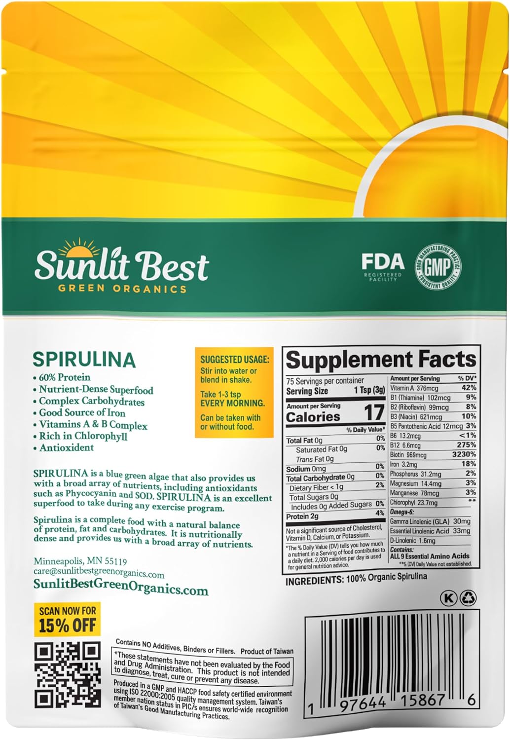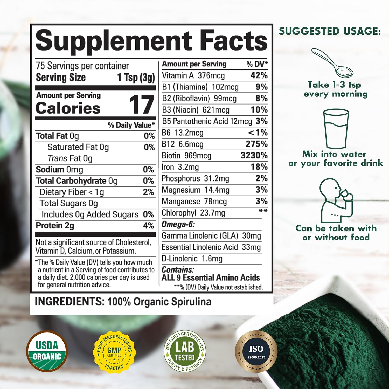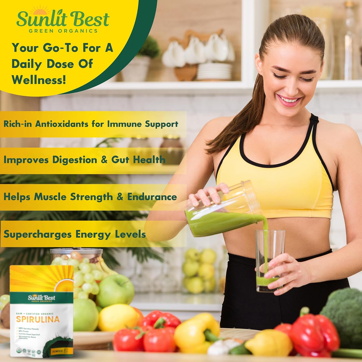 Nutrient-Dense Superfood: Our Organic Blue-Green Spirulina Powder is a blue-green algae that provides you with a broad array of rich nutrients, including chlorophyll, vegan protein, and Antioxidant Phycocyanin and Superoxide Dismutase (SOD). Our Non-GMO and gluten-free spirulina super greens offer a complete and natural balance of protein, fat, and carbohydratesChlorophyll-Rich Spirulina For Optimal Health: Our potent, natural, USDA Certified Organic Blue-Green Spirulina Powder nourishes your cells to help boost energy levels, support a strong immune system, remove toxins and chemicals from the body, help reduce inflammation, and support digestion & gut health. Our raw, vegan protein-rich Spirulina powder is an integral part of your natural wellness regime & overall healthy, energetic lifestyle!Nutritional Powerhouse: Sunlit Best Green Organics' Spirulina powder is a complete vegan protein powder, including chlorophyll, 9 essential amino acids, flavonoids, loaded with fiber, rich-in antioxidants, vitamins and minerals (Vitamin A, Vitamin B Complex, Vitamin C, Vitamin K and Biotin, Iron, Magnesium, Manganese, Phosphorus). Our super greens powder is healthier than any sugar laden energy drink, your go-to for a daily dose of wellnessVersatile Use & Enhanced Absorption: Our Spirulina Powder is made of raw and pure Spirulina (Platensis) which is micronized for faster and optimal nutrient absorption. It is low-temperature treated to preserve its rich, nutrient-dense profile. Our powder is zero impurities and maximum potency. Add a scoop to your favorite smoothies, shakes, oats, breakfast bowls, baked goods or desserts