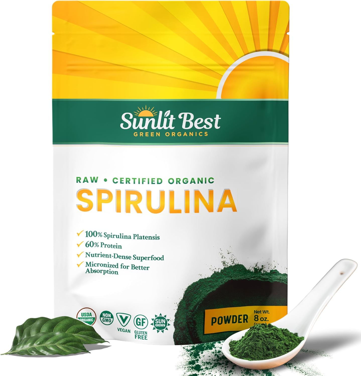 Sunlit Best Usda Organic Spirulina Powder - Blue-Green Algae, Raw & Vegan Source Of Protein & Chlorophyll | Non-Gmo & Gluten-Free Superfood Energy Drink | Gut Health & Immune Support Supplement, 8 Oz
