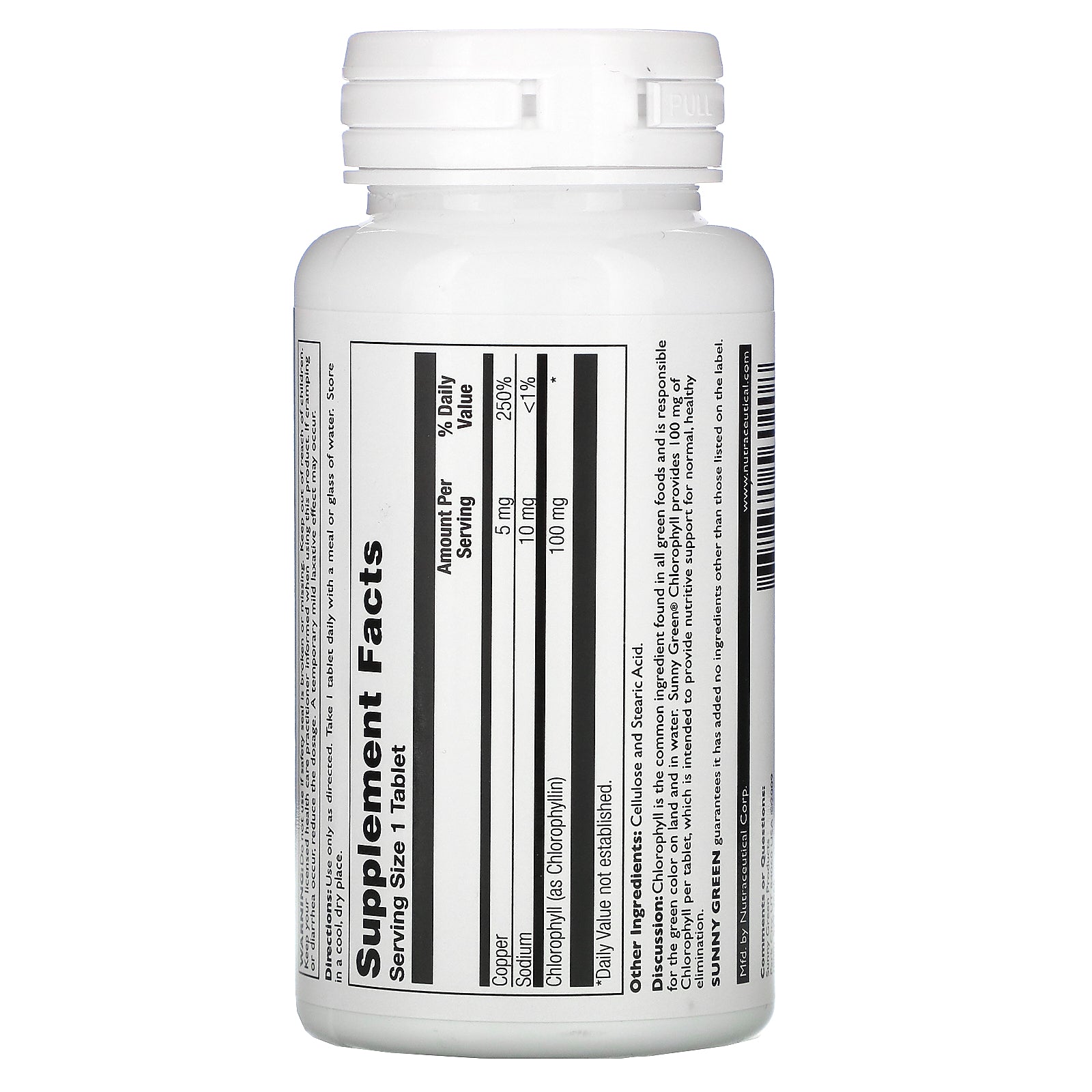 Discussion: Chlorophyll is the common ingredient found in all green foods and is responsible for the green color on land and in water. Sunny Green Chlorophyll provides 100 mg of Chlorophyll per tablet, which is intended to provide nutritive support for normal, healthy elimination.