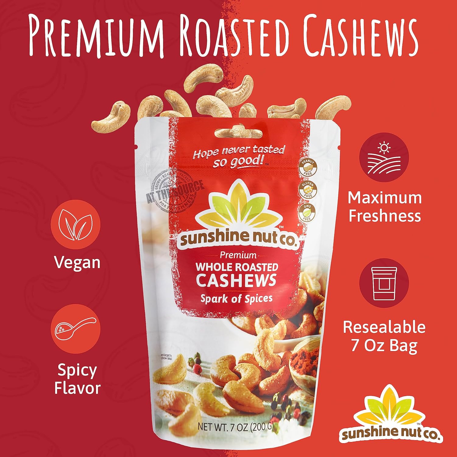 Sunshine Nut Company Whole Roasted Lightly Salted Cashews, Spark Of Spices Flavor, 4 Pack, 7 Oz. Each, Gluten Free, Peanut Free And Vegan Individual Snack Packs For Kids And Adults, Gmo Free