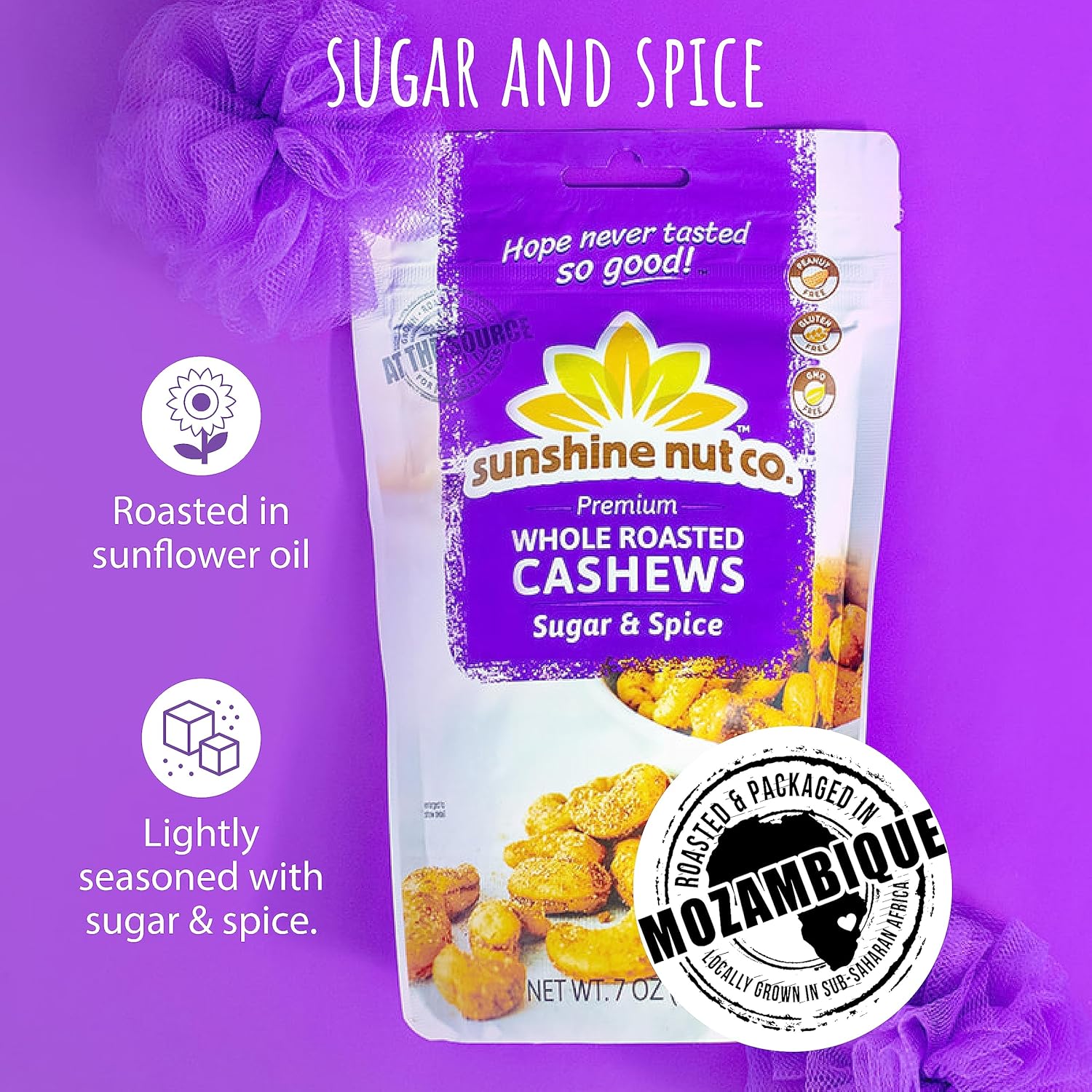 About this item SWEET WHOLE ROASTED CASHEWS Roasted whole in sunflower oil and sprinkled with sugar, spice, and everything nice, enjoy the naturally enhanced flavor of fresh and crunchy cashews! Our delicious cashews are a special roasted treat for any sweet nut-lover out there. HEALTHY SNACKS Cashews are one of natureās healthiest and tastiest snacks! Filled with plant proteins and antioxidants, they are a heart-healthy nut with a satisfying crunch! With zero trans fats and zero cholesterol, our nuts are unique in flavor and freshness. They are GMO free, gluten free, and made in a peanut free facility so that anyone can enjoy! ON THE GO SNACKS Busy day ahead of you Whether itās school, work, or travel, our individual cashew snack packs are the perfect on-the-go treat for anyone on the run! Sunshine Nut Co. Cashews are great for parties, sharing with friends, hiking, camping, and munching on after a workout. And for the fellow nut-lovers in your life, theyāll make an awesome gift! WORLDS BEST CASHEWS Unlike many cashew retailers, our cashews are locally harvested and quickly processed for uncommonly fresh-tasting nuts, all in beautiful Mozambique. Our cashew crop gets shelled, roasted, and packaged by local staff who love producing and sending out Mozambican products out for the rest of the world to enjoy. Made fresh and delicious every time! SUNSHINE NUTS COMPANY Our tasty cashews are more than just a snack ā itās a way to support local Mozambican farmers with the tools and resources to thrive! Our core goal is job creation and community care for Mozambicans. We make the worldās best to make the world better, delivering quality snacks and providing kindness and care to those around us. See more product details,SWEET WHOLE ROASTED CASHEWS Roasted whole in sunflower oil and sprinkled with sugar, spice, and everything nice, enjoy the naturally enhanced flavor of fresh and crunchy cashews! Our delicious cashews are a special roasted treat for any sweet nut-lover out there,HEALTHY SNACKS Cashews are one of natureās healthiest and tastiest snacks! Filled with plant proteins and antioxidants, they are a heart-healthy nut with a satisfying crunch! With zero trans fats and zero cholesterol, our nuts are unique in flavor and freshness. They are GMO free, gluten free, and made in a peanut free facility so that anyone can enjoy!,ON THE GO SNACKS Busy day ahead of you Whether itās school, work, or travel, our individual cashew snack packs are the perfect on-the-go treat for anyone on the run! Sunshine Nut Co. Cashews are great for parties, sharing with friends, hiking, camping, and munching on after a workout. And for the fellow nut-lovers in your life, theyāll make an awesome gift!,WORLDS BEST CASHEWS Unlike many cashew retailers, our cashews are locally harvested and quickly processed for uncommonly fresh-tasting nuts, all in beautiful Mozambique. Our cashew crop gets shelled, roasted, and packaged by local staff who love producing and sending out Mozambican products out for the rest of the world to enjoy. Made fresh and delicious every time!,SUNSHINE NUTS COMPANY Our tasty cashews are more than just a snack ā itās a way to support local Mozambican farmers with the tools and resources to thrive! Our core goal is job creation and community care for Mozambicans. We make the worldās best to make the world better, delivering quality snacks and providing kindness and care to those around us