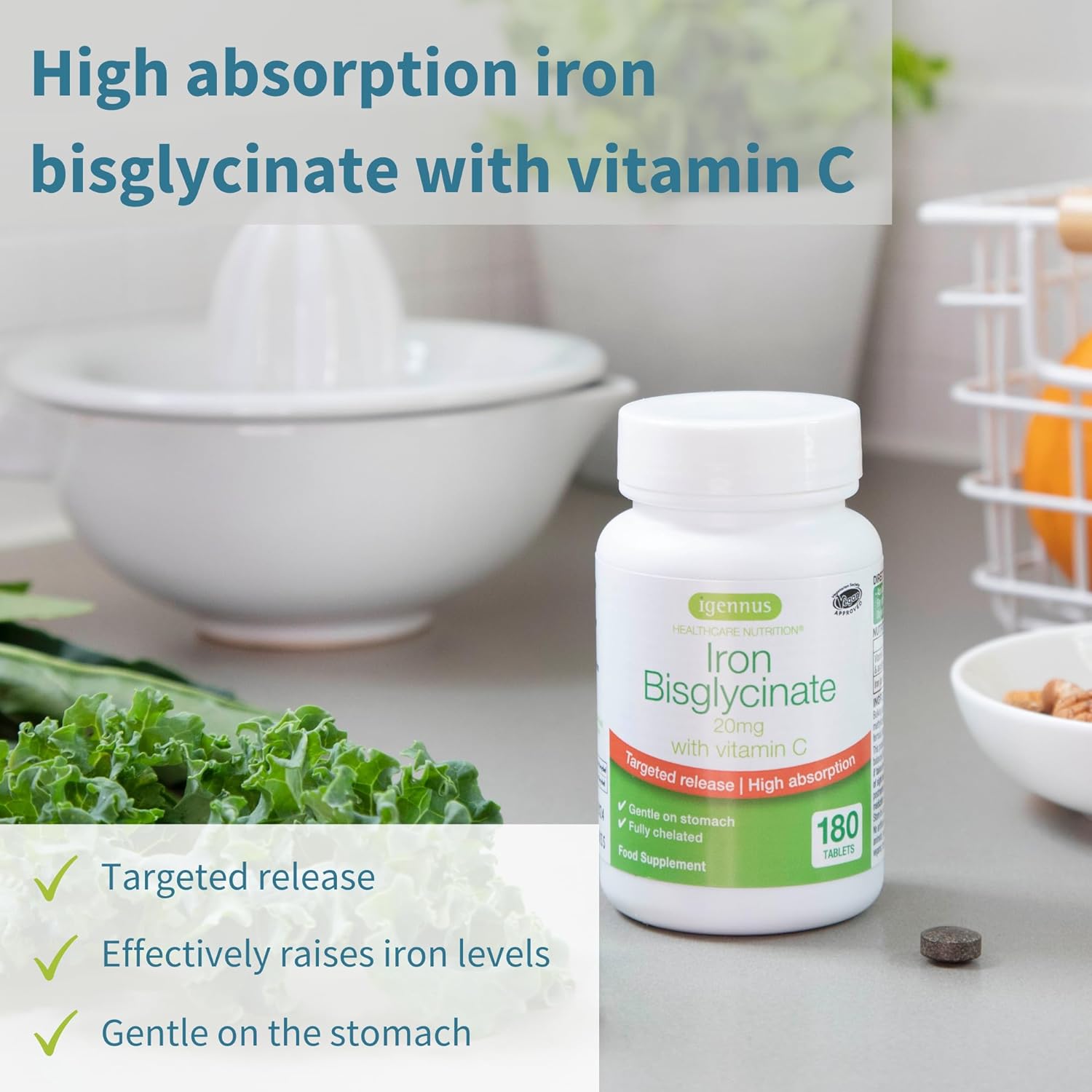 2 > IRON COMPLEX WITH VITAMIN C โ expertly formulated to raise ferritin levels higher, with an effective daily dose of 20mg of bioavailable iron bisglycinate, combined with vitamin C to support the transport of iron, enhancing uptake in the body