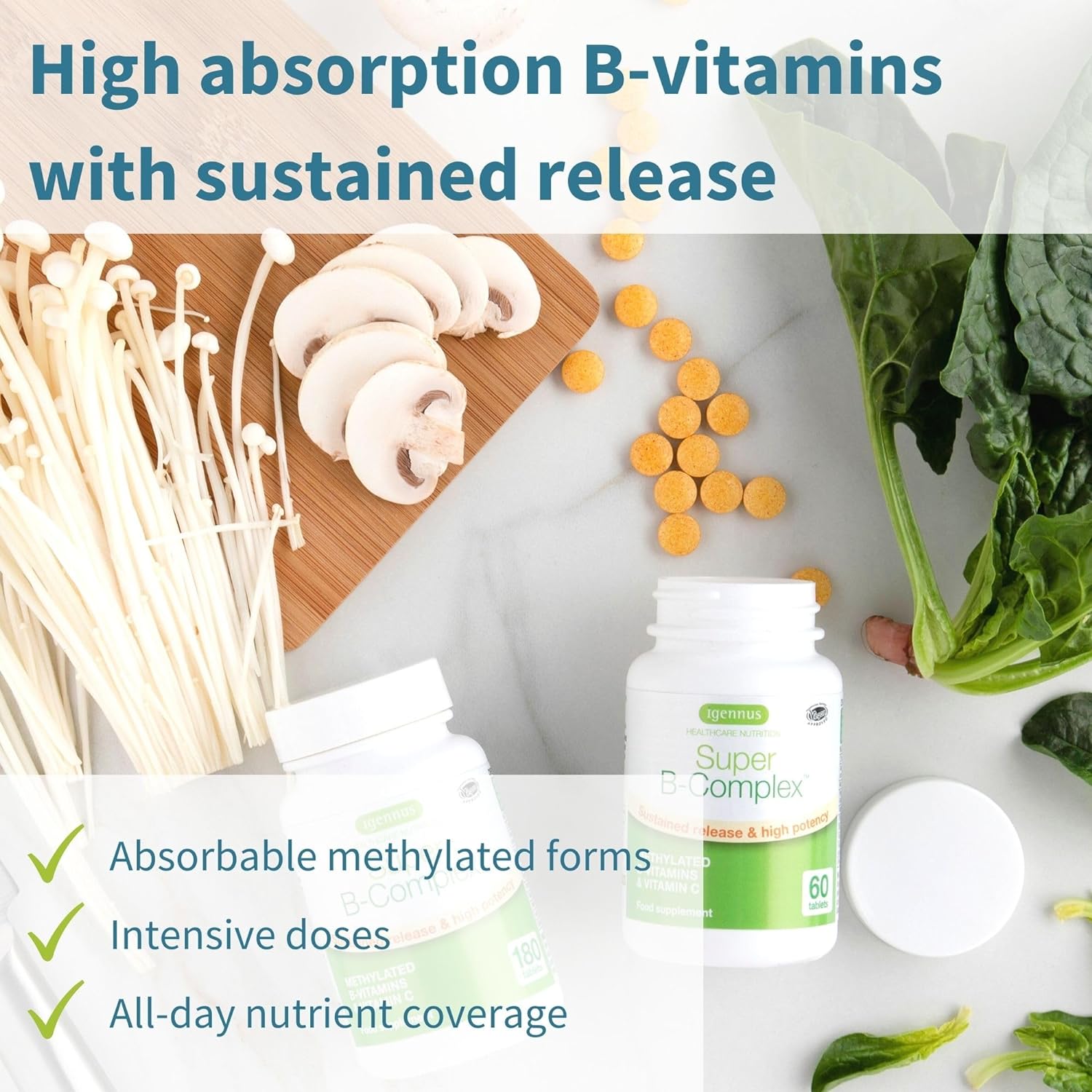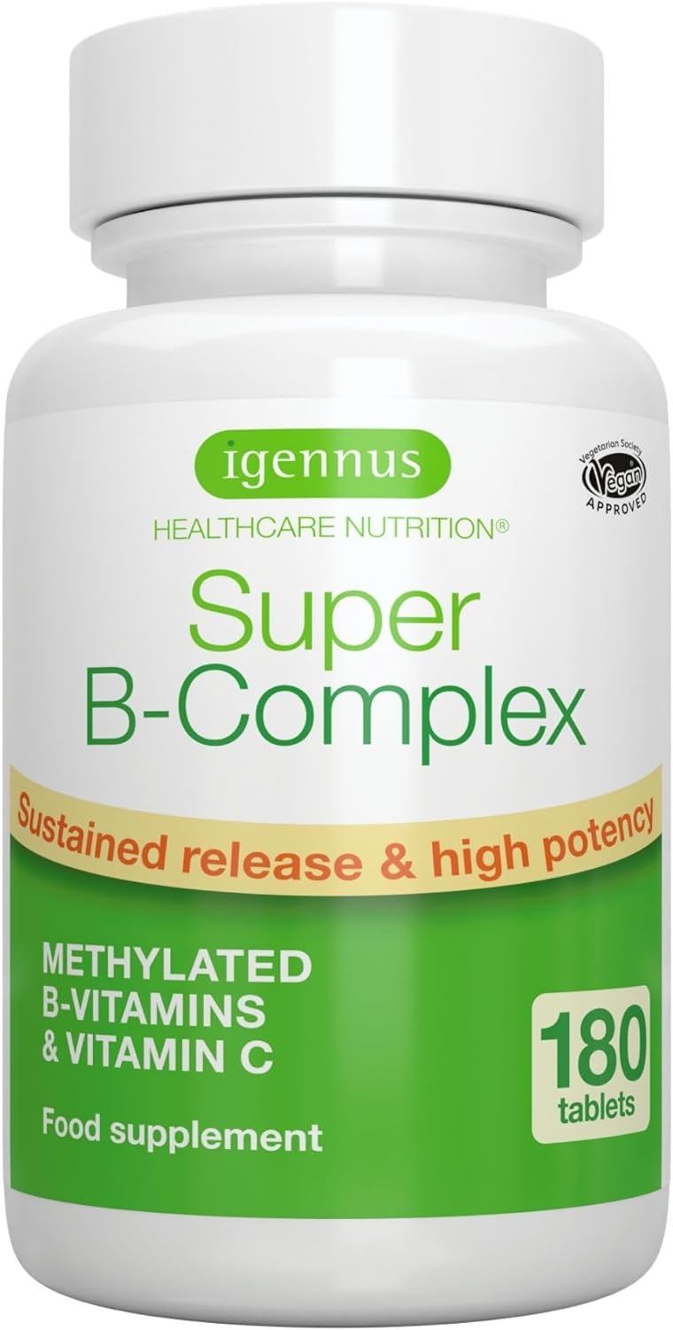 DESCRIPTION : Super B-Complex - High Absorption Methylated B Vitamins, Clean Label, 180 Sustained Release Tablets - Complete Spectrum of B Vitamins with Folate, Boosted B12 & Vitamin C, 90 Servings, by Igennus