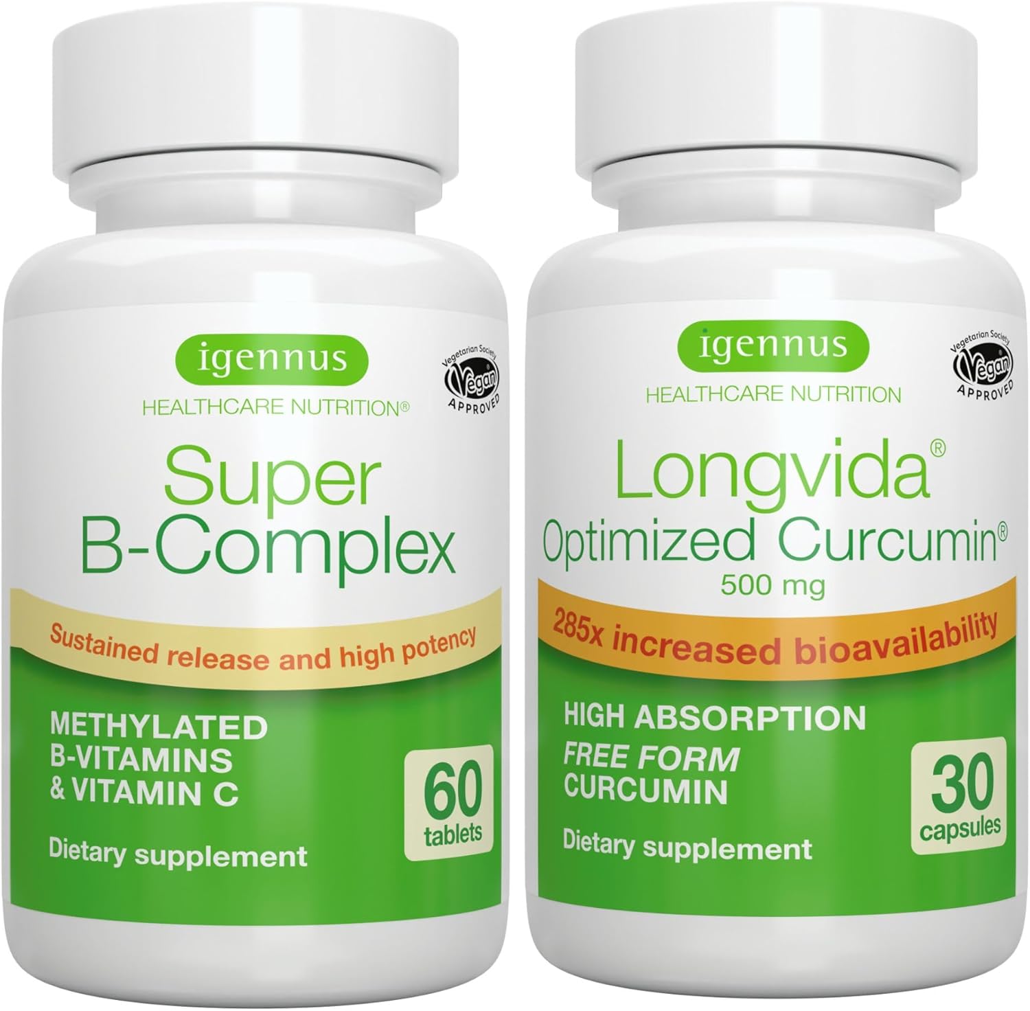 Super B-Complex & Longvida Lipidated Curcumin 500Mg Vegan Bundle, Methylated Sustained Release B Complex With Ultra Bioavailable & Sustained Action Curcumin, By Igennus