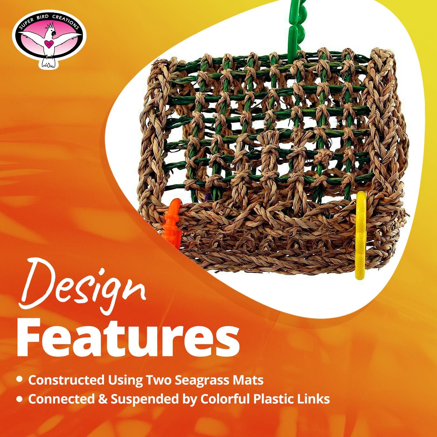 DESIGN FEATURES – The Seagrass Tent bird toy is constructed using two seagrass mats that are connected and suspended by colorful Plastic baby links. Utilizing a diverse selection of stimulating materials, colors, textures and shapes make Super Bird Creations toys of maximum interest to pet birds