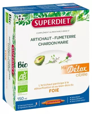 Super My Targeted Detox Liver Organic 10 Phials Is An Organic Food Supplement In Form Of Drinkable Phials Based On Artichoke, Fumitory And Milk Thistle. Super Diet Has Selected Three Organic Plants: