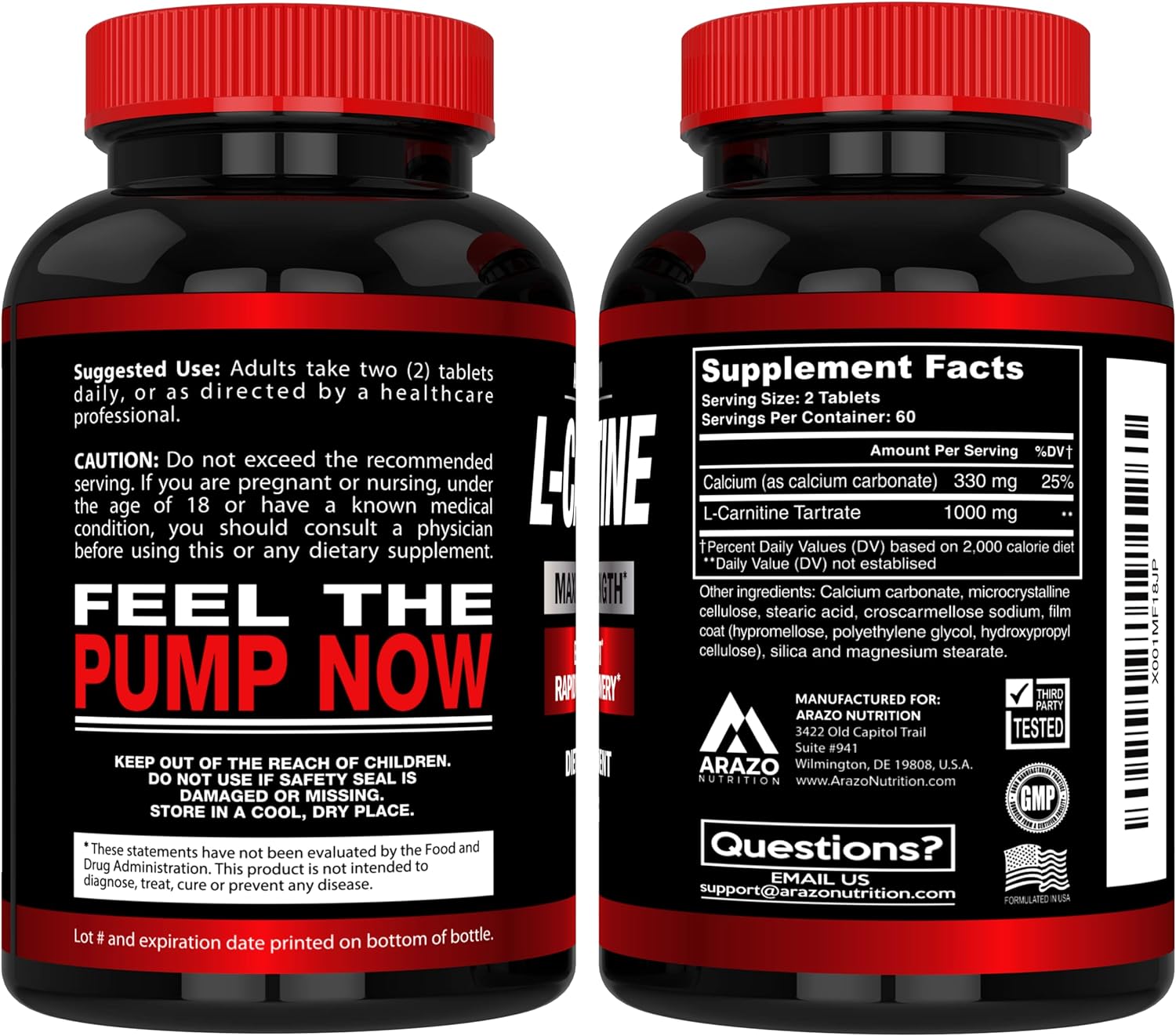 DESCRIPTION : Super Strength L-Carnitine 1000mg Servings Plus Calcium for Boosted Metabolism and Improved Muscle Gain - Arazo Nutrition