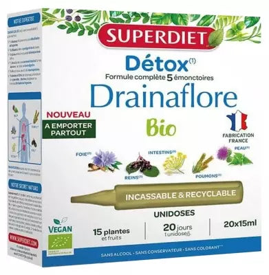 Superdiet Drainaflore Organic Detox 20 Unidoses Is A Food Supplement That Contains An Exclusive Complex Of 15 Plants And Fruits: The Birch Participates In The Process Of Detoxification Of The Body, Chicory Helps To Protect The Liver From Toxins, Elderberry Is Known To Help The Renal Elimination Of Water, The Fennel Contributes To The Good Intestinal Transit. Like Aloe Vera, It Contributes To A Good Digestion, Pine Contributes To The Well-Being Of The Respiratory Tract, Burdock And Nettle Are Recognized For The Maintenance Of A Clear Skin. Burdock Also Helps The Elimination Functions Of The Body. Recommended At The Change Of Season And Whenever The Need Arises. The Single-Doses Can Be Taken Everywhere. They Are Unbreakable And Recyclable. No Alcohol, No Preservatives, No Coloring. Certified Organic Agriculture. Control Fr-Bio-10. Vegan