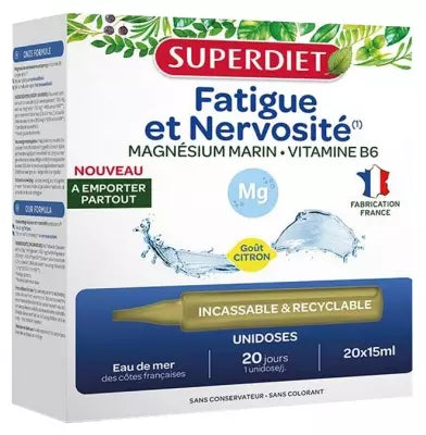 Superdiet Marine Magnesium + Vitamin B6 20 Unidoses Is A Food Supplement Based On Magnesium And Vitamin B6 That Help Reduce Fatigue And Normal Functioning Of The Nervous System. Lemon Taste. The Single-Doses Can Be Taken Everywhere. They Are Unbreakable And Recyclable. Preservative Free, Dye Free