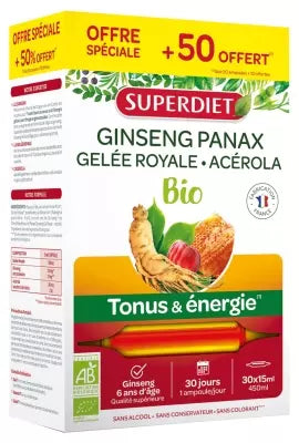 Superdiet Organic Ginseng Royal Jelly And Acerola 20 Phials + 10 Phials Freeis A Dietary Supplement To Contribute To Tone And Energy: Ginseng Known To Contribute To Physical And Mental Vitality. A Privilege Of Emperors Who Have Always Been In Asia, It Was Chosen For Its 6-Year-Old Panax Ca Meyer Quality And Its Ginsenoside Content; Royal Jelly Is The Exclusive Food Of The Queen Bee Whose Lifespan Is 40 Times Longer Than A Worker Bee; Organic Acerola, Also Called "Antilles Cherry" Is A Red Berry With A Tangy Taste. Alcohol-Free, Preservative-Free, Colorant-Free. Certified Organic Farming. Fr-Bio-10 Control