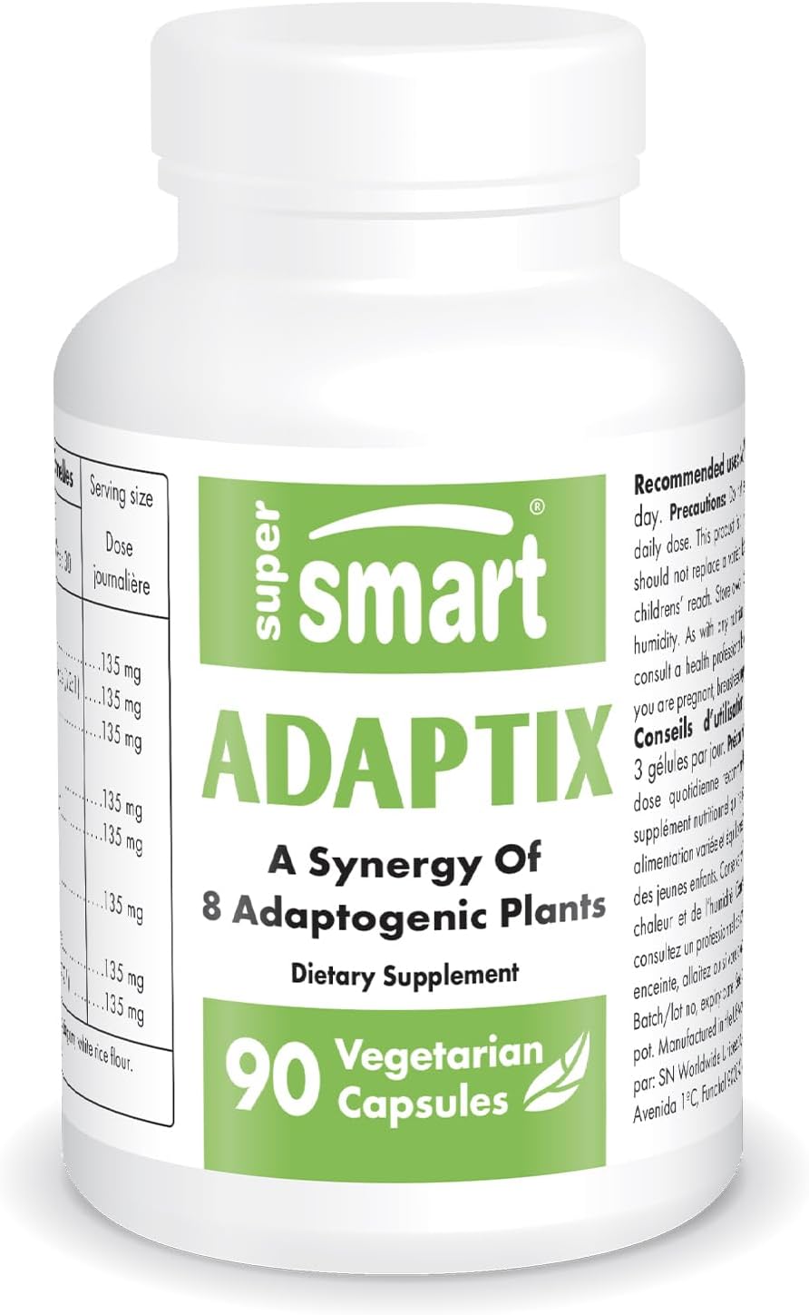About this item WHAT IS IT Adaptix is a synergistic blend of eight plant extracts in vegetarian capsules, with adaptogen properties that improve the body's ability to cope with all types of stress. WHAT ARE THE BENEFITS Together, the eight extracts in Adaptix provide several benefits, helping to relieve the symptoms of fatigue, boost stamina, and promote emotional and mental well-being. HOW TO TAKE IT Take 3 capsules a day CONTAIN: Extract of ashwagandha root 1.5 % withanolide, Extract of astragalus root (12:1), Extract of reishi (4:1), Extract of Korean ginseng root 20 % ginsenosides, Extract of suma root (4:1), Extract of Rhodiola rosea root 2 % rosavins, Extract of Schisandra chinensis fruit 9 % schisandrin, Extract of goji berries (10:1) | Other ingredients: Acacia gum, rice flour. 100% Satisfaction - Since 1992, Supersmart wants you to be fully satisfied. Ping us 24/7 regarding any questions you may have. See more product details, WHAT IS IT Adaptix is a synergistic blend of eight plant extracts in vegetarian capsules, with adaptogen properties that improve the body's ability to cope with all types of stress, WHAT ARE THE BENEFITS Together, the eight extracts in Adaptix provide several benefits, helping to relieve the symptoms of fatigue, boost stamina, and promote emotional and mental well-being, HOW TO TAKE IT Take 3 capsules a day, CONTAIN: Extract of ashwagandha root 1.5 % withanolide, Extract of astragalus root (12:1), Extract of reishi (4:1), Extract of Korean ginseng root 20 % ginsenosides, Extract of suma root (4:1), Extract of Rhodiola rosea root 2 % rosavins, Extract of Schisandra chinensis fruit 9 % schisandrin, Extract of goji berries (10:1) | Other ingredients: Acacia gum, rice flour,100% Satisfaction - Since 1992, Supersmart wants you to be fully satisfied. Ping us 24/7 regarding any questions you may have