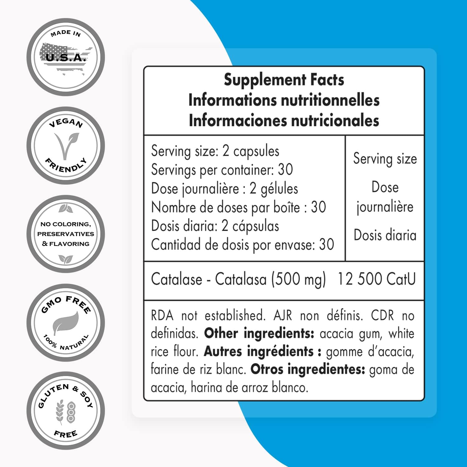 Recommended Use - Take 2 capsules a day. Delayed Relased capsules are gastro-resistant for greater effect. Each delayed release capsule contains 250 mg of Catalase. Contains Catalase (500 mg) - 12,500 CatU | Other Ingredients: Acacia Gum and White Rice Flour