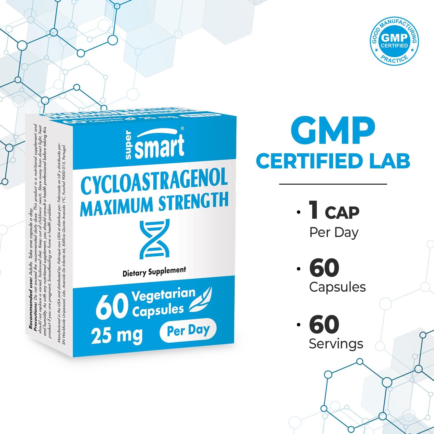 About this item CYCLOASTRAGENOL SUPPLEMENT - Cycloastragenol is a cutting-edge telomere supplement that harnesses the power of this natural compound extracted from the Astragalus membranaceus plant. 98% PURITY - Our Cycloastragenol Maximum Strength formula delivers a potent 20mg of 98% pure cycloastragenol per capsule. NON-GMO, GLUTEN FREE, SOY FREE, VEGAN - Supersmart offers you an outstanding quality and choice of supplements for women and men, difficult to find elsewhere. Recommended Use - Take 1 capsule a day. Each capsule contains 25mg cycloastragenol. Contains Cycloastragenol | Other ingredients: acacia gum, white rice flour. 100% Satisfaction - Since 1992, Supersmart wants you to be fully satisfied. Ping us 24/7 regarding any questions you may have. See more product details,CYCLOASTRAGENOL SUPPLEMENT - Cycloastragenol is a cutting-edge telomere supplement that harnesses the power of this natural compound extracted from the Astragalus membranaceus plant,98% PURITY - Our Cycloastragenol Maximum Strength formula delivers a potent 20mg of 98% pure cycloastragenol per capsule,NON-GMO, GLUTEN FREE, SOY FREE, VEGAN - Supersmart offers you an outstanding quality and choice of supplements for women and men, difficult to find elsewhere,Recommended Use - Take 1 capsule a day. Each capsule contains 25mg cycloastragenol. Contains Cycloastragenol | Other ingredients: acacia gum, white rice flour,100% Satisfaction - Since 1992, Supersmart wants you to be fully satisfied. Ping us 24/7 regarding any questions you may have