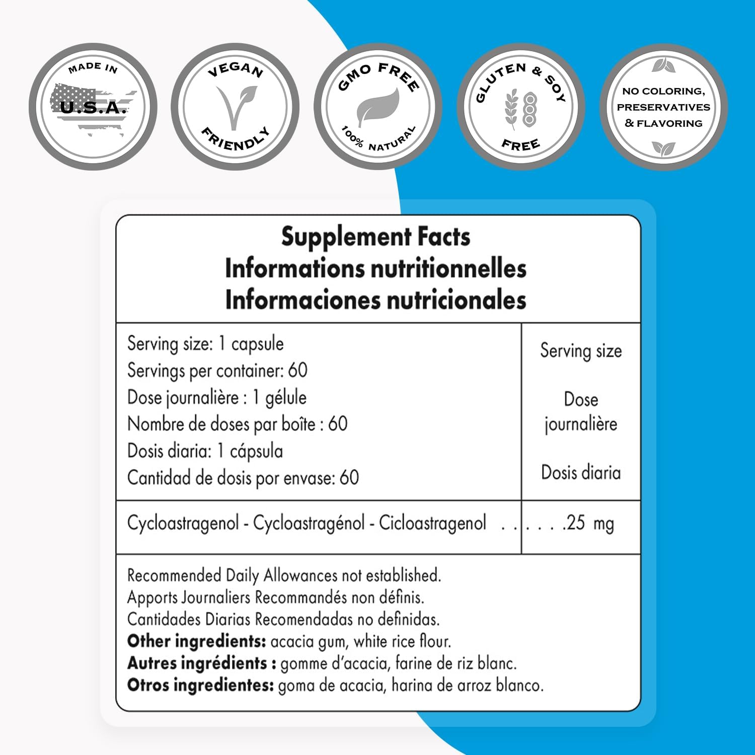 Recommended Use - Take 1 capsule a day. Each capsule contains 25mg cycloastragenol. Contains Cycloastragenol | Other ingredients: acacia gum, white rice flour